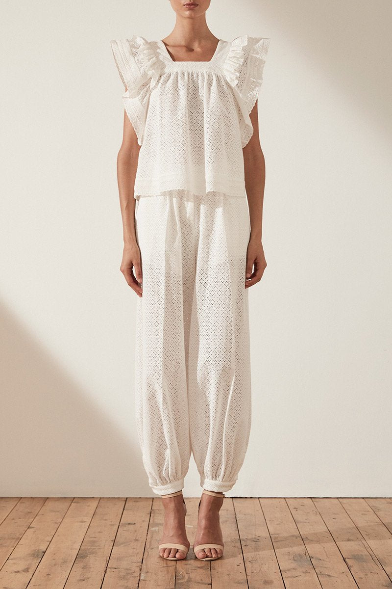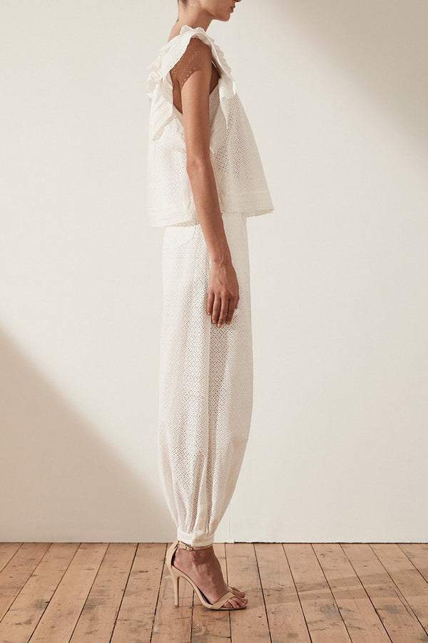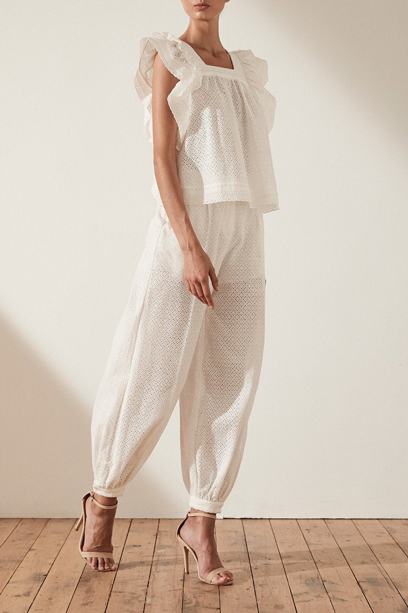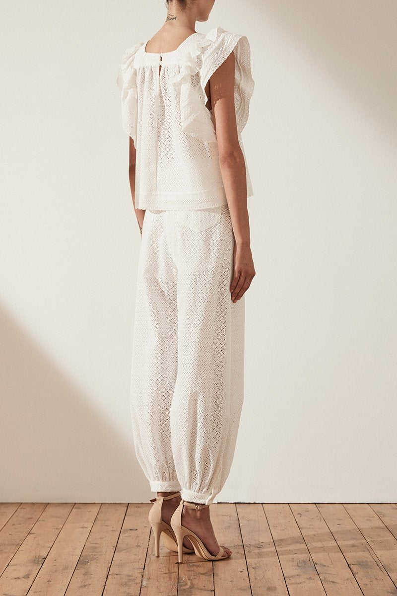 Baby doll top in a medium weight embroidered cotton with a semi-sheer appearance. This top features square neckline, keyhole back with button closure and ruffle lined armhole