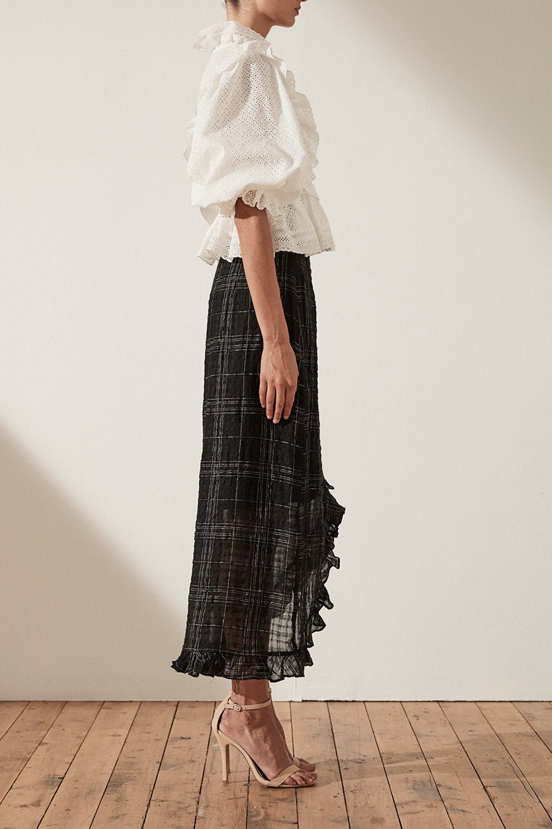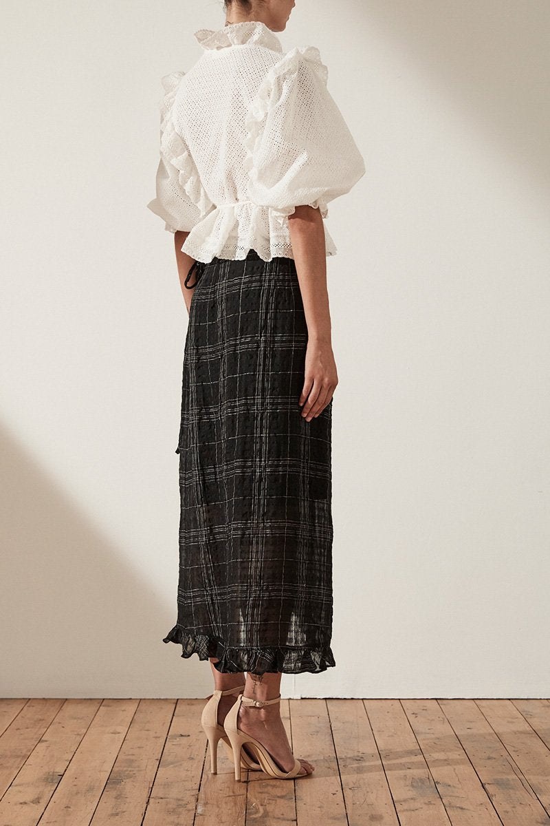 Puff sleeve wrap blouse in a medium weight embroidered cotton with a semi-sheer appearance. This top features low v neckline, wrap front, puff sleeve with elasticated cuff and partial lining