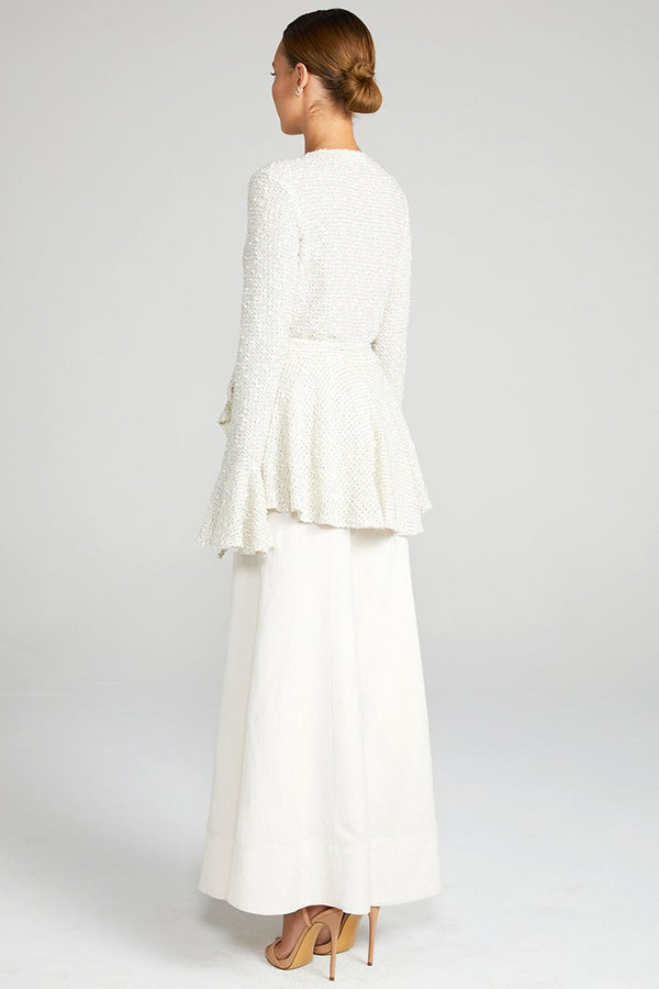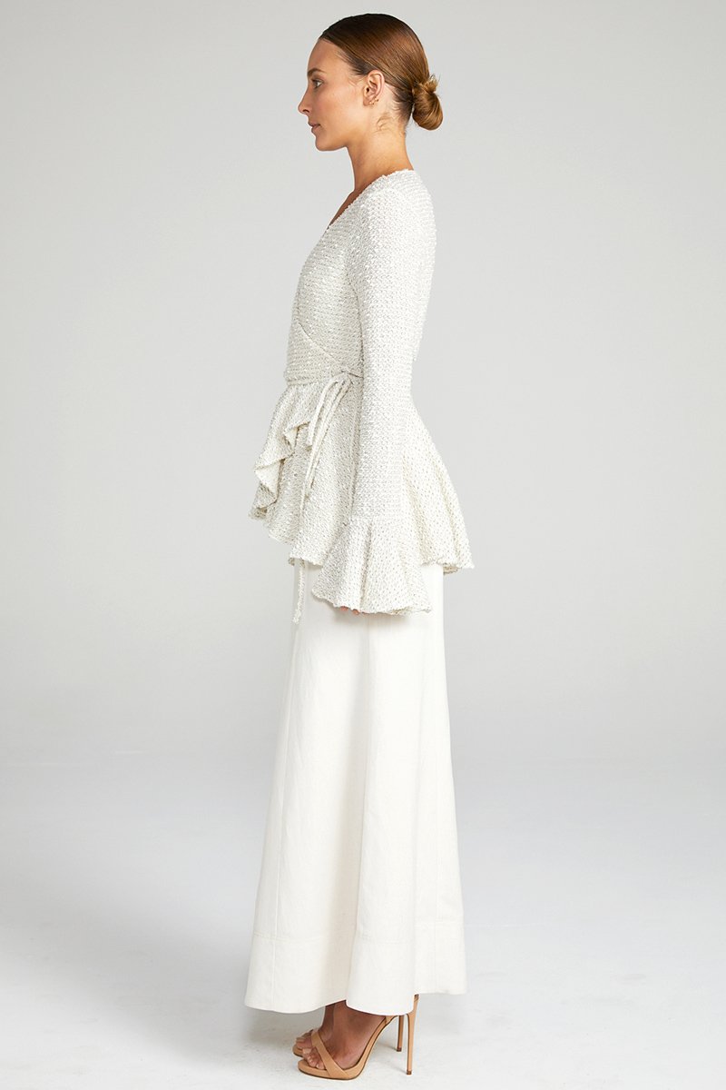 Frill cuff wrap top in a medium weight textured boucle knit. This top features cross over front with waist tie, midi length sleeves with flared cuff and asymmetric hem