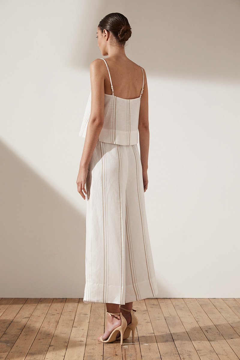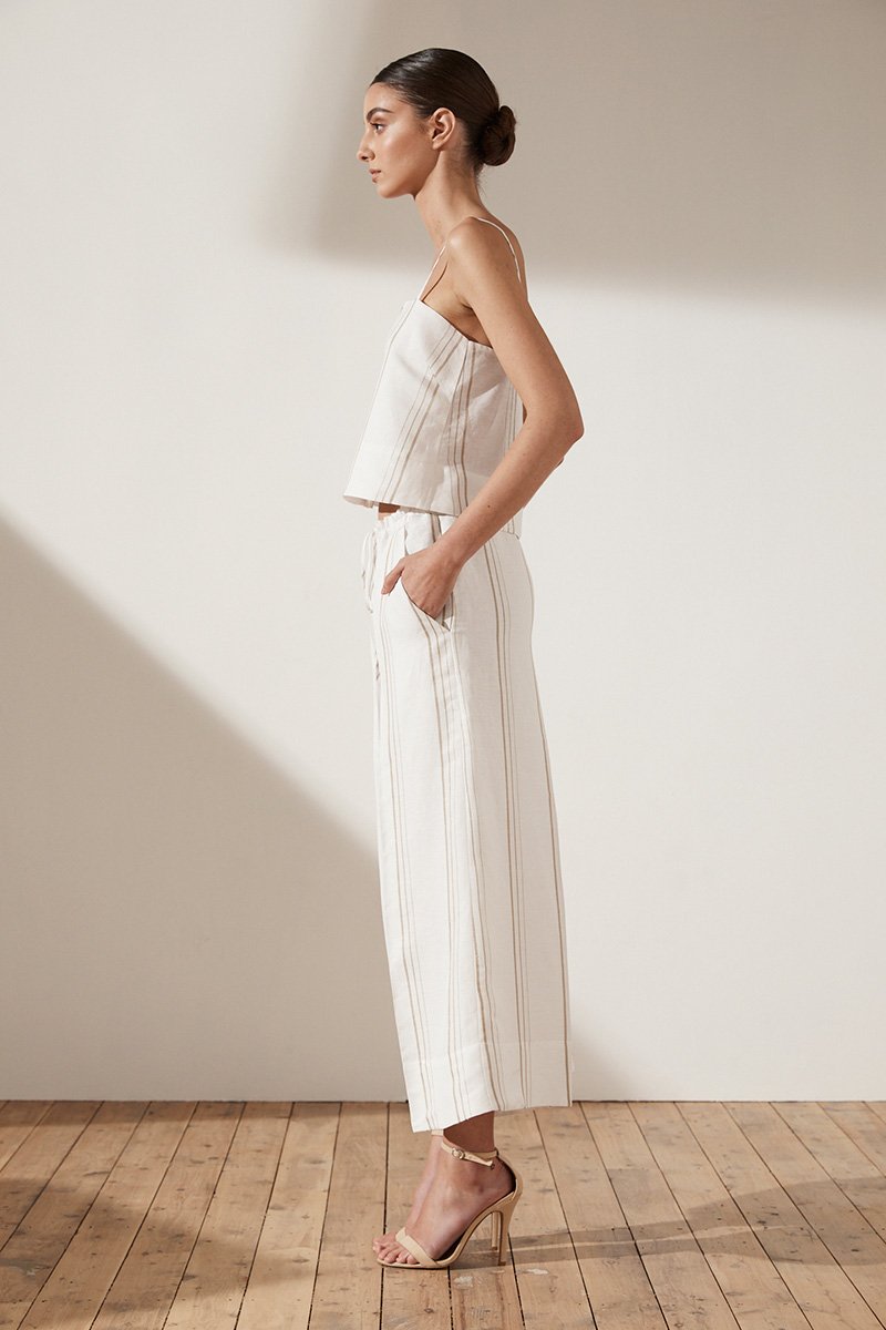 Button up camisole in the Alba stripe. This top in a light weight linen blend features adjustable spaghetti straps, front button opening and cropped hem