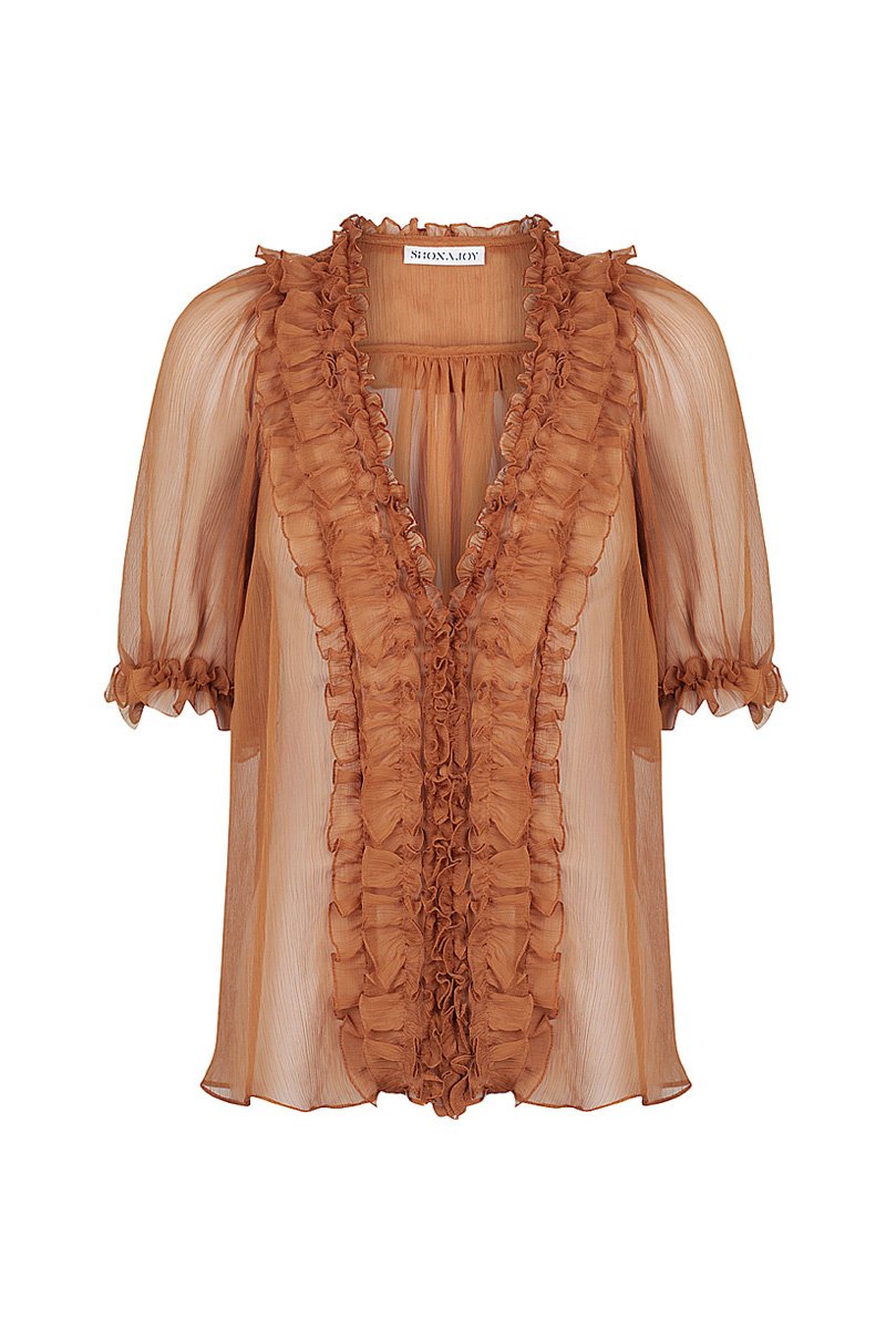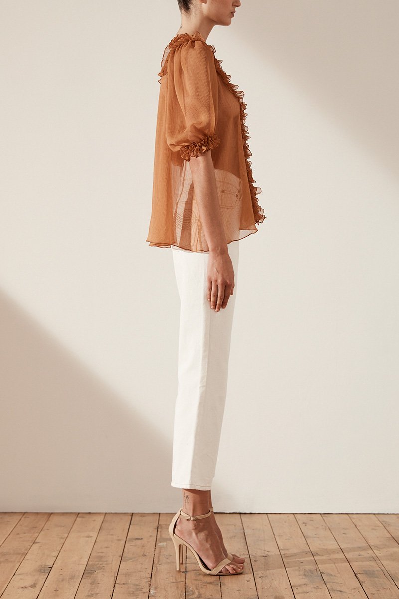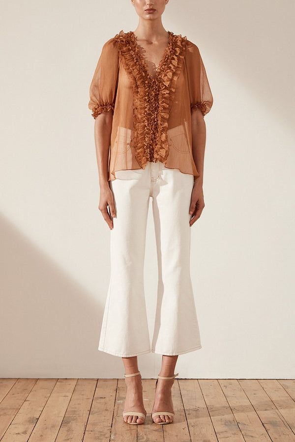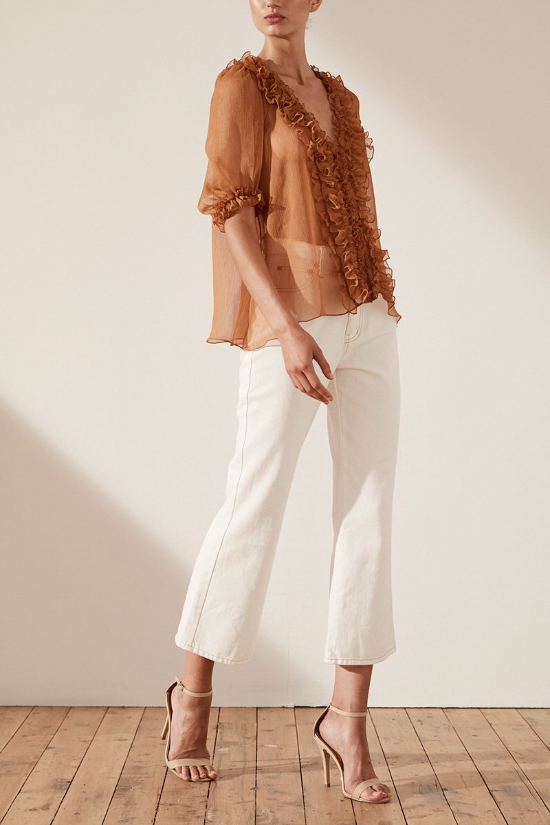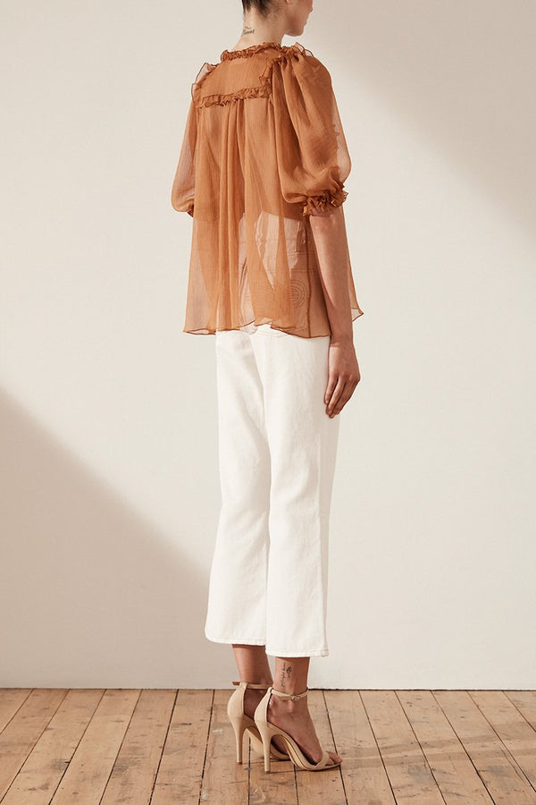 Puff sleeve blouse in a light weight crinkle chiffon fabric with a semi-sheer appearance. This blouse features low v neckline with ruffle trim and puff sleeve with elasticated cuff