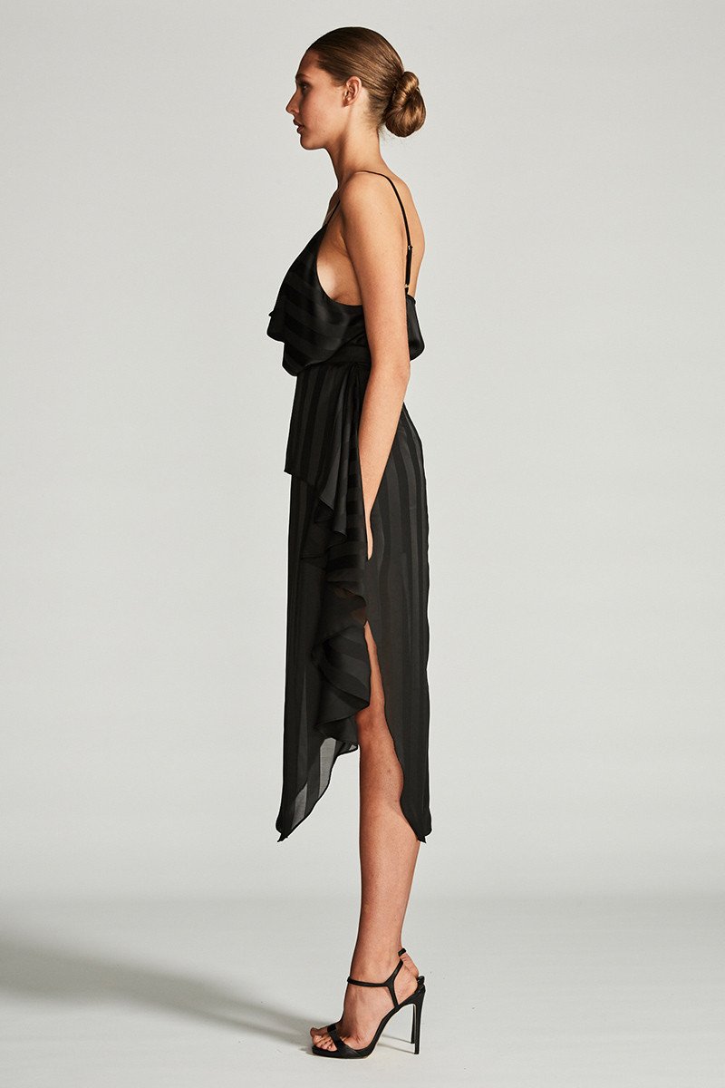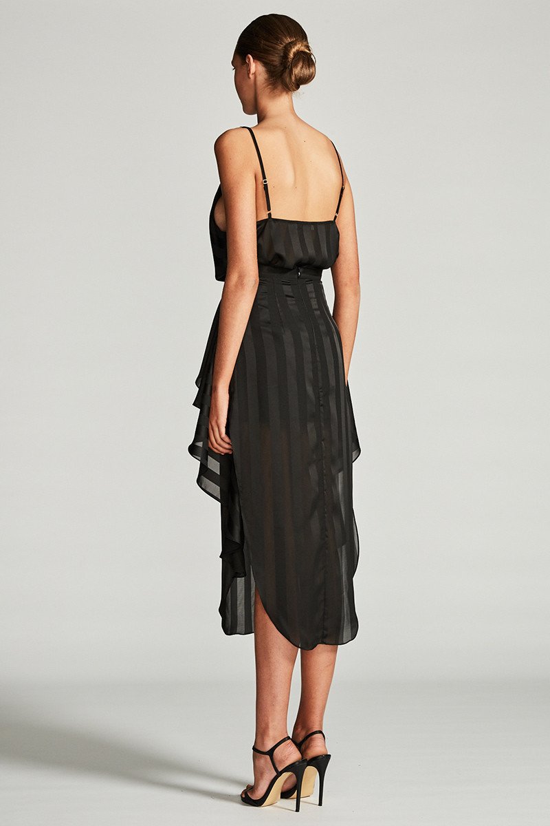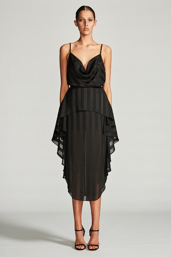 Cowl camisole in a light weight sheer ribbon stripe fabric. This top features adjustable spaghetti straps, cowl neckline and side splits