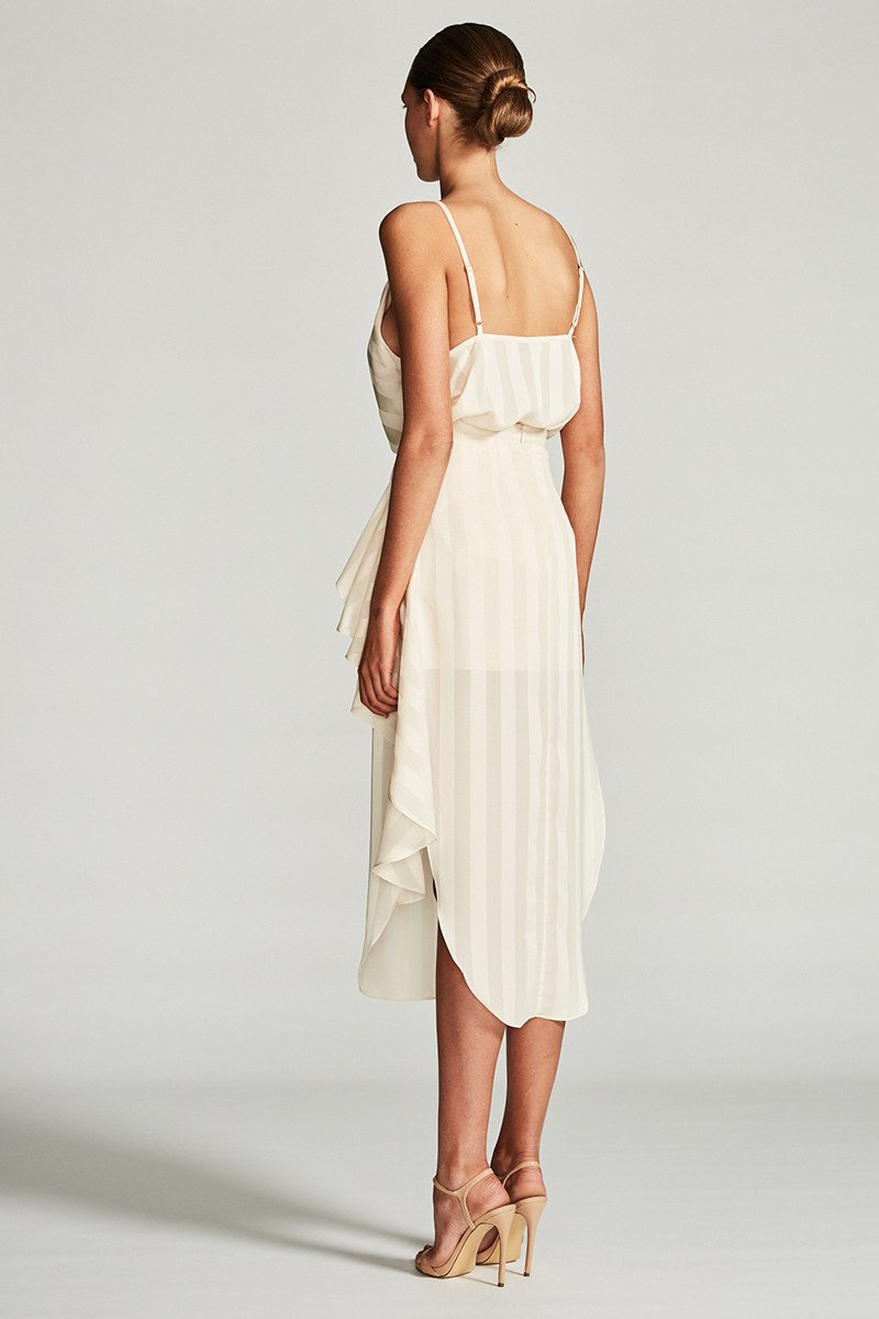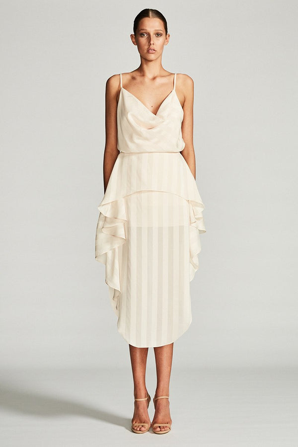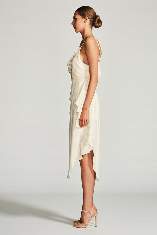 Cowl camisole in a light weight sheer ribbon stripe fabric. This top features adjustable spaghetti straps, cowl neckline and side splits