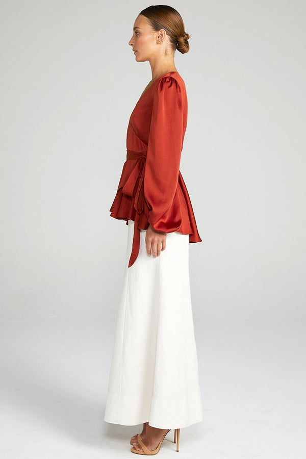 Puff sleeve wrap blouse in a medium weight woven with a silk touch. This blouse features low neckline, cross over front with waist tie and long sleeve with elasticated cuff