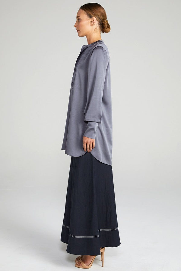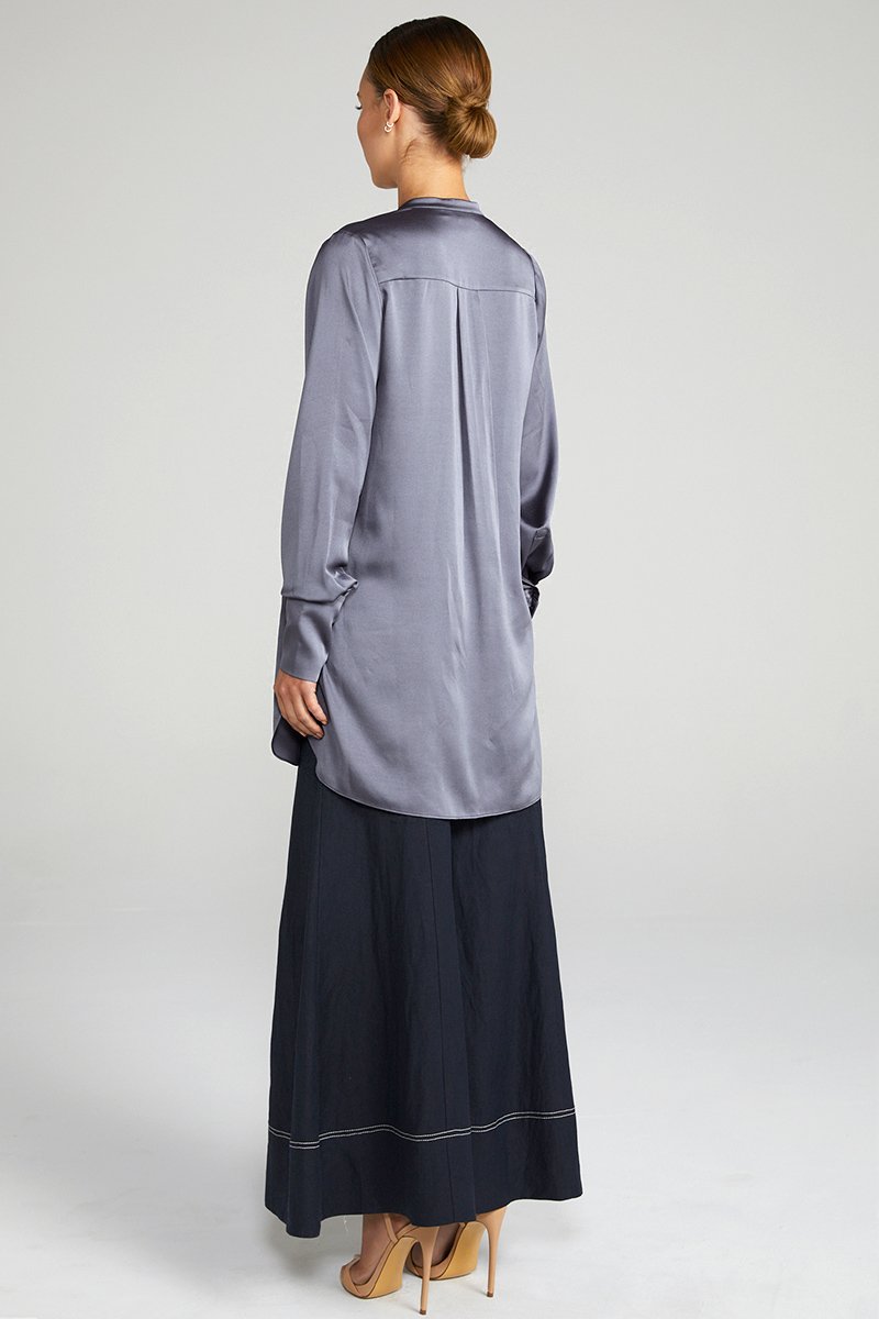 Tuxedo shirt in a medium weight woven with a silk touch. This shirt features stand collar, front button opening, long sleeves with button cuff opening and side splits at hem