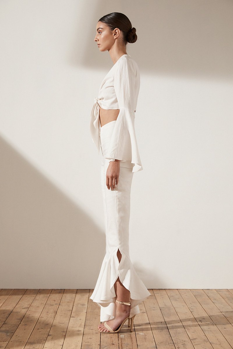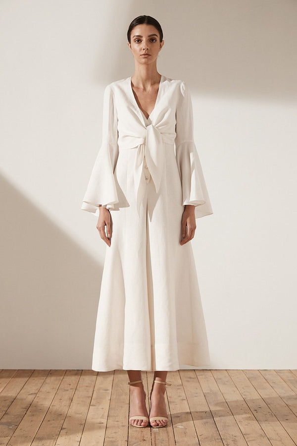 Flared sleeve tie front top in a medium weight linen blend fabric. This top features tie front closure, flared sleeves and lining