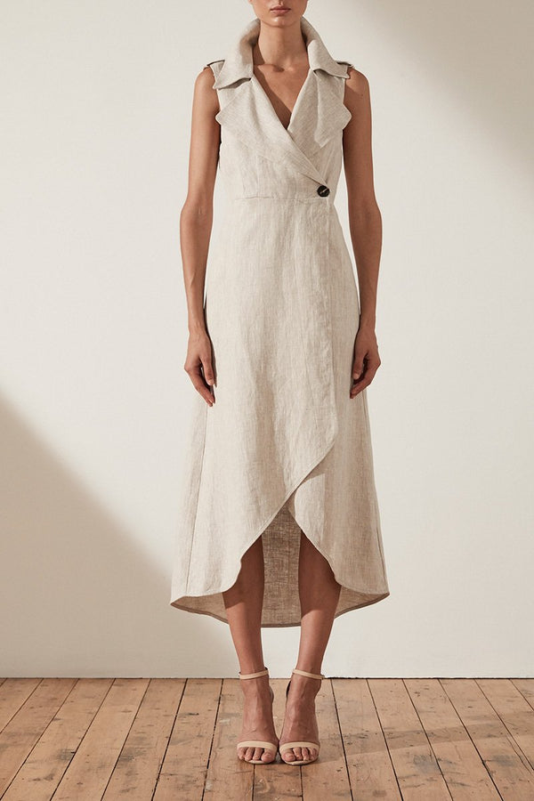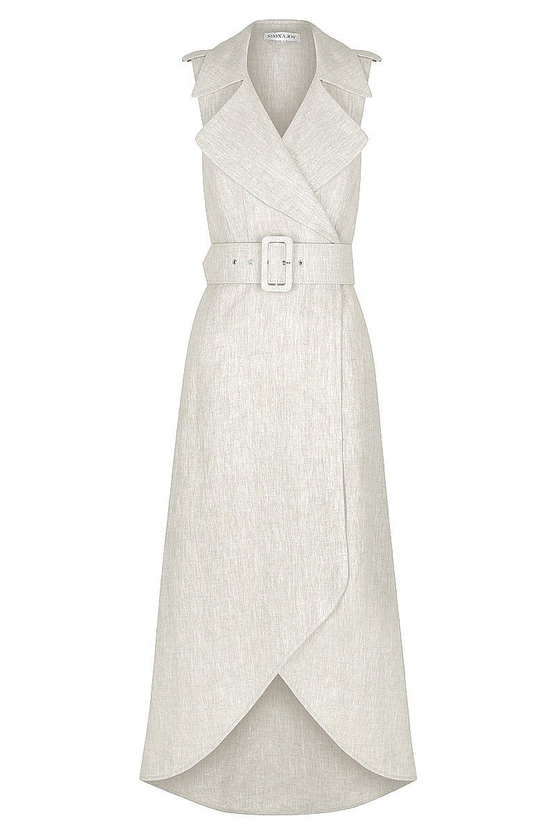 Sleeveless trench midi dress in a medium weight linen. This dress features draped collar, wide lapels, front single button opening, side pockets, detachable belt and asymmetrical hem