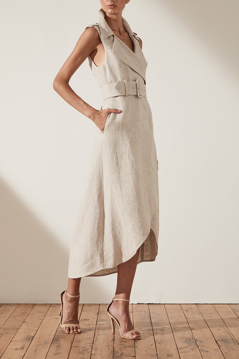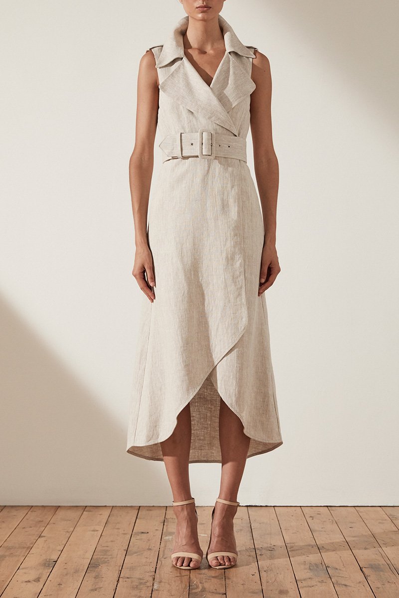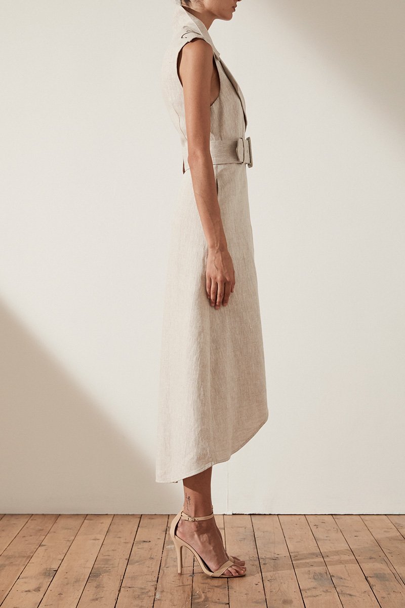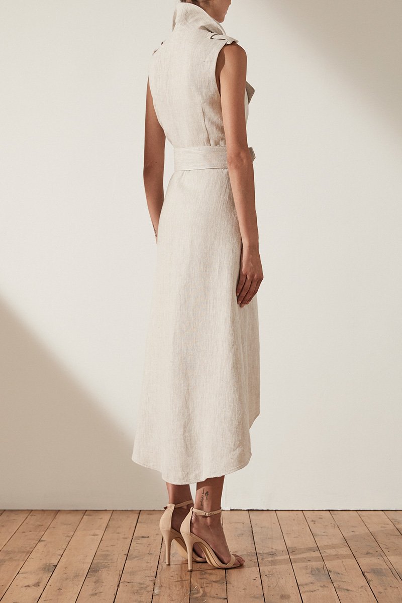 ATTICUS LINEN SLEEVELESS TRENCH MIDI DRESS WITH BELT