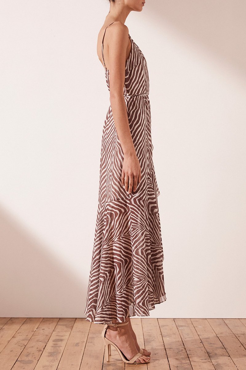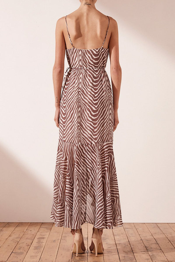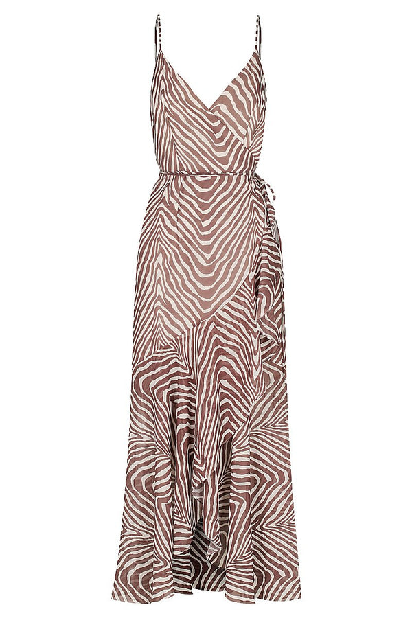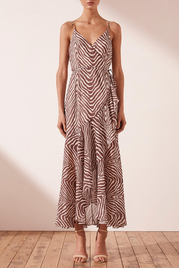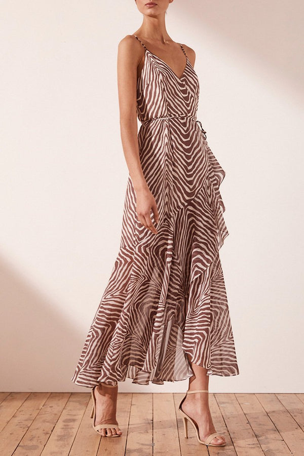 Cocktail wrap dress in the exclusive Benita zebra print. This dress in a light weight chiffon with a semi-sheer appearance features adjustable spaghetti straps, low v neckline, cross over front with self wrap tie fastening, midi skirt with asymmetrical flounce hem and short lining
