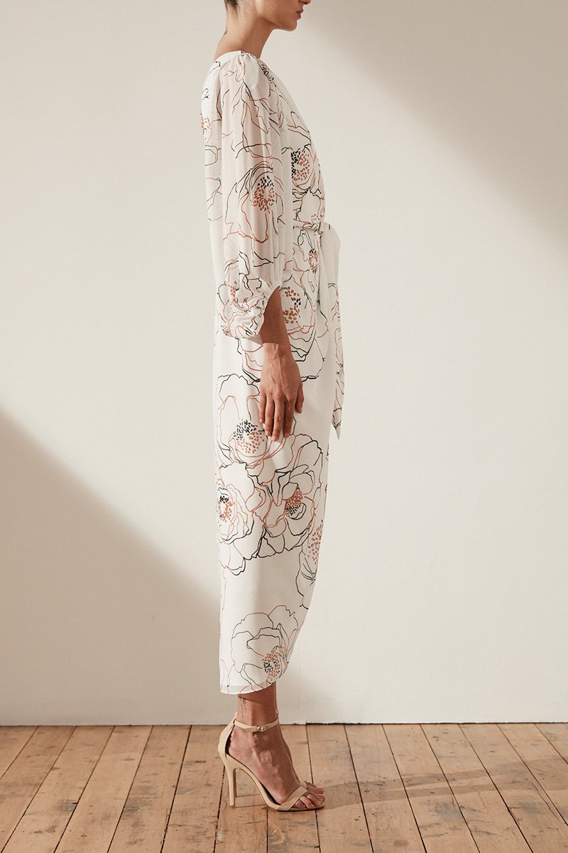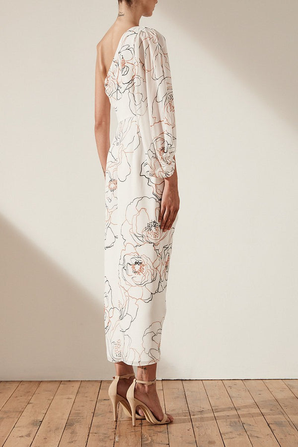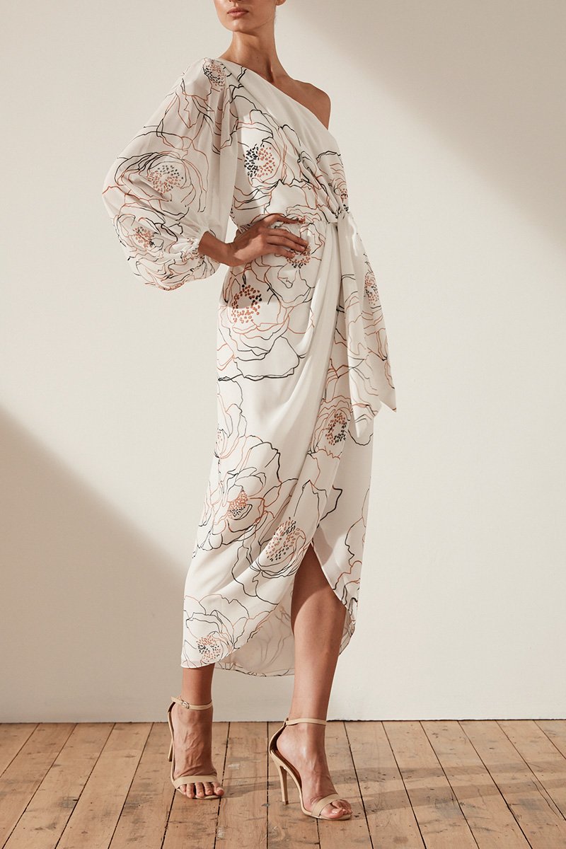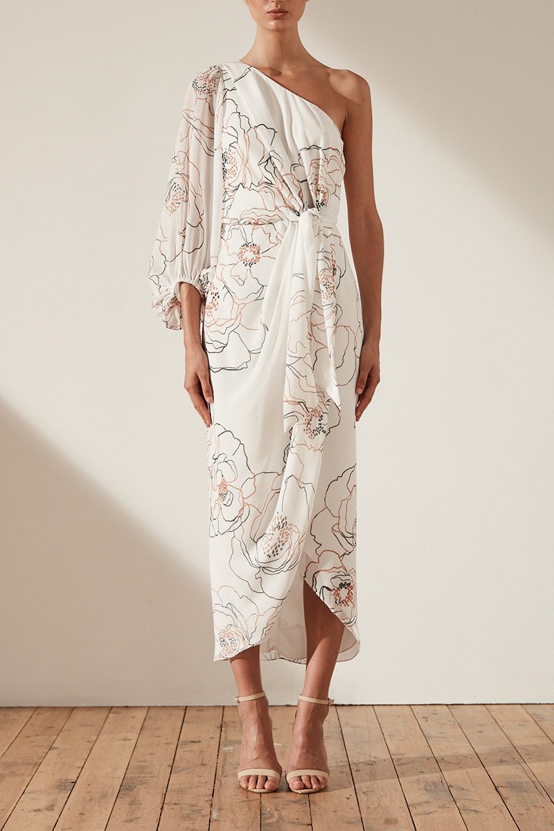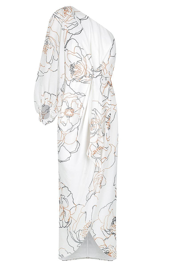 One shoulder tie front draped midi dress in the exclusive Chiara print. This dress in a light weight chiffon with a semi-sheer appearance features one shoulder, midi length voluminous sleeve with elasticated cuff, tie front bodice, invisible side zip, draped midi skirt with front split and lining