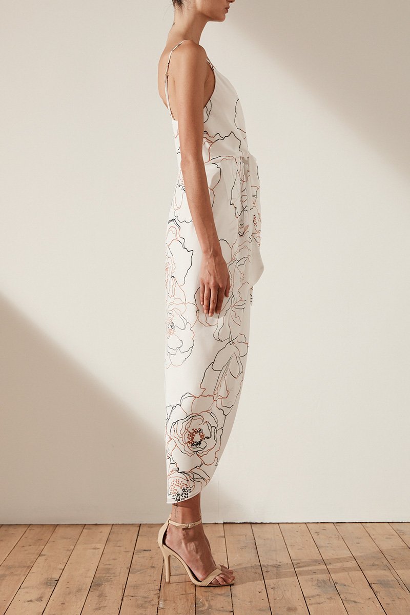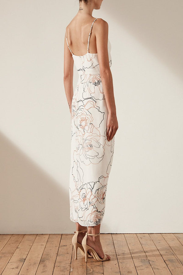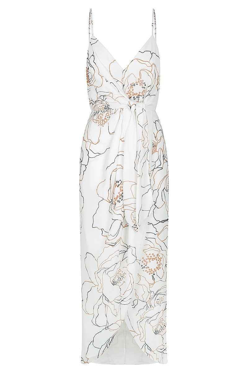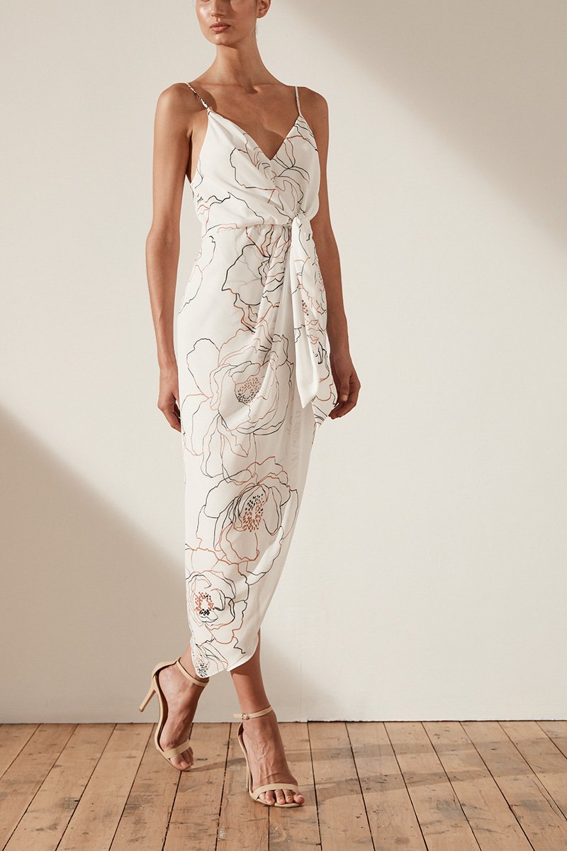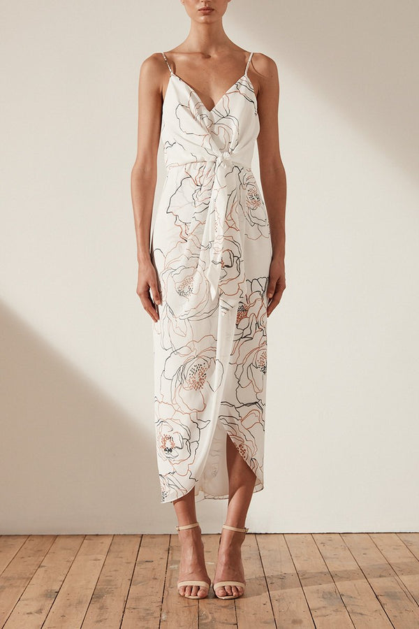 Tie front draped midi dress in the exclusive Chiara print. This dress in a light weight chiffon with a semi-sheer appearance features adjustable spaghetti straps, low v neckline, tie front bodice, invisible back zip, draped midi skirt with front split and full lining