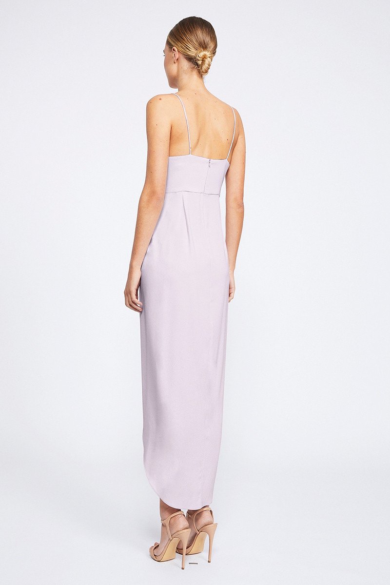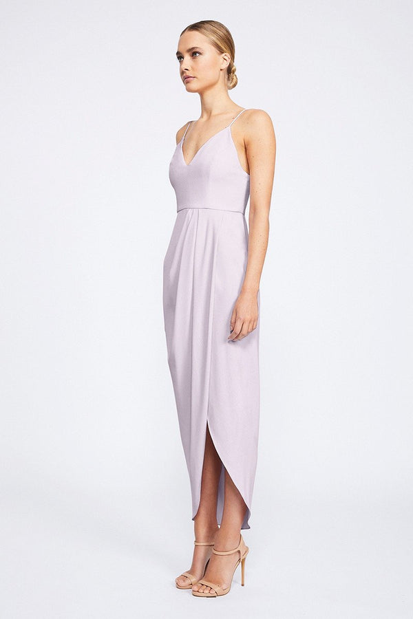 Our signature maxi cocktail dress. This dress features spaghetti straps, low v neckline, a cross over draped skirt with front split, invisible back zip and asymmetric hem