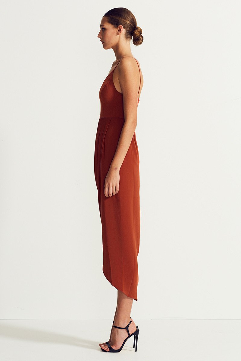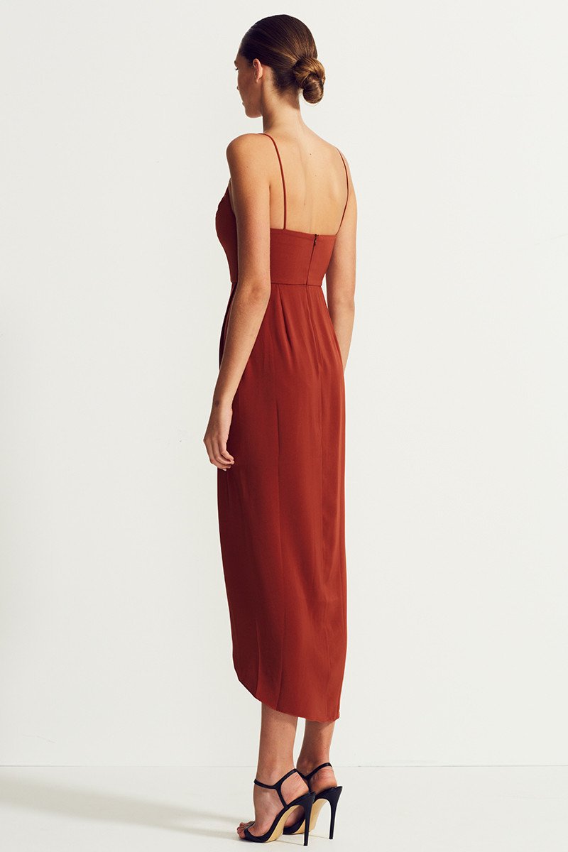 Our signature high neck ruched dress. This dress features high ruched neckline, a cross over draped skirt with front split, invisible back zip and asymmetric hem