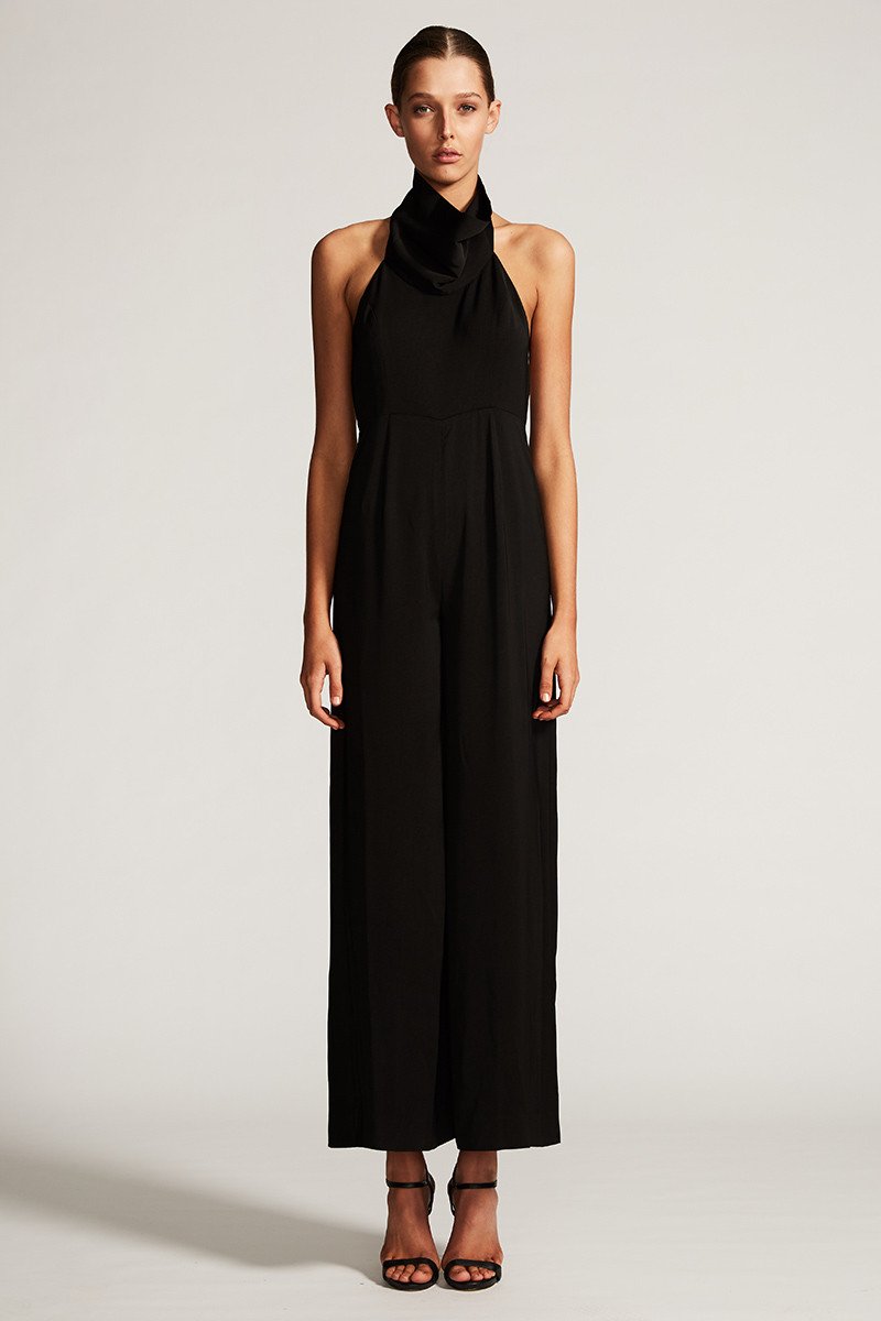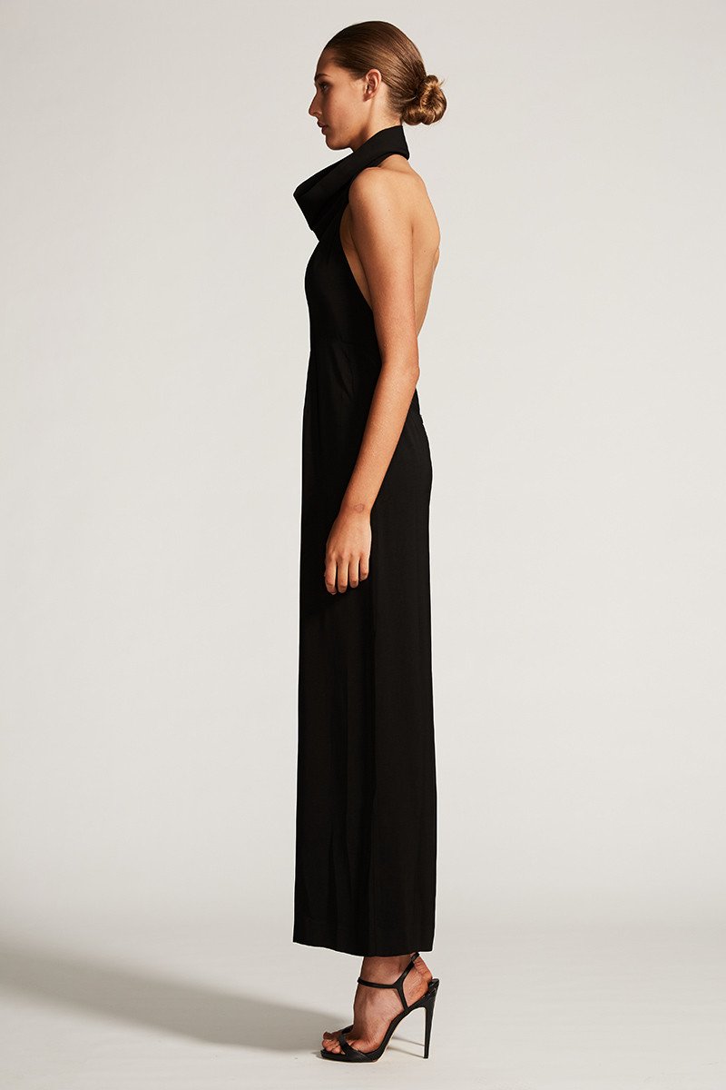 Funnel neck backless jumpsuit in a medium weight woven fabric. This jumpsuit features a funnel high neck, cut away back, draped maxi length pants and invisible back zip