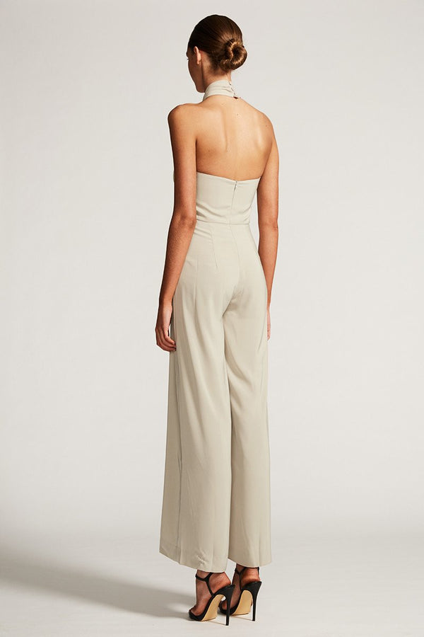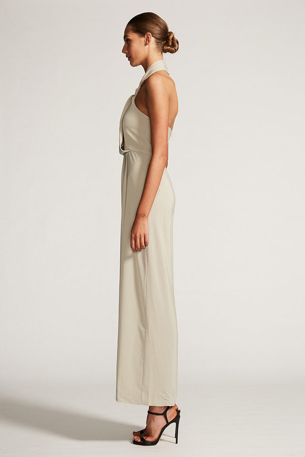 Draped maxi jumpsuit in a medium weight woven fabric. This jumpsuit features a knot detail and ruched fabric at the neck, triple button halter neck fastening, draped maxi length pants and luxe gold back zip