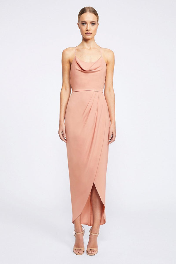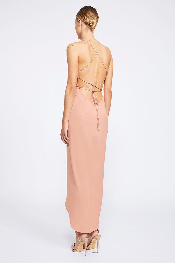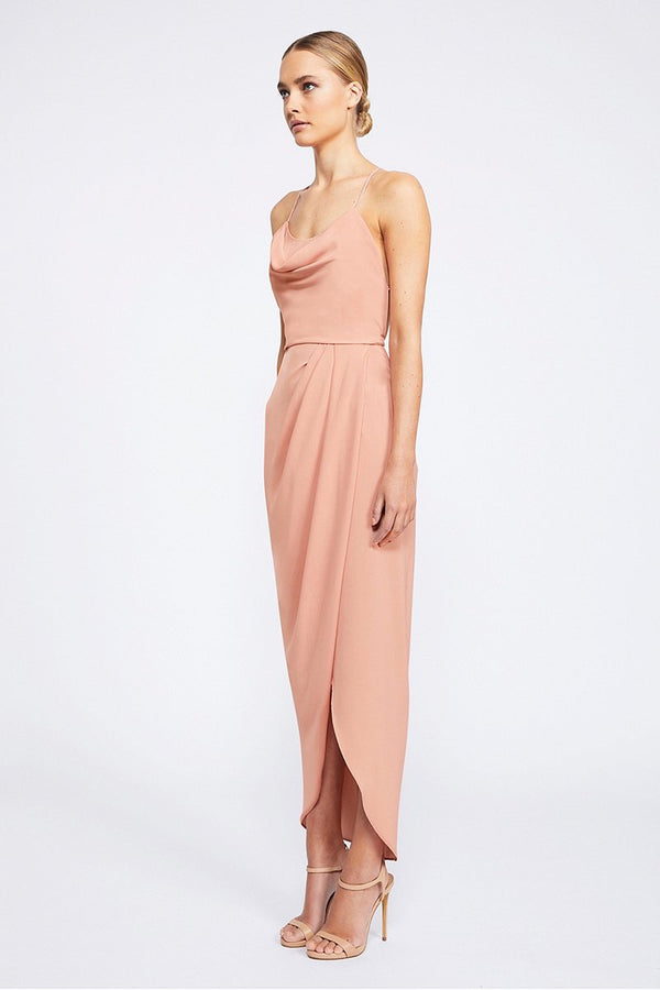 Our signature lace up cowl maxi dress. This dress features a draped cowl neckline, cross over spaghetti straps with a lace up back, tie at waist, a cross over draped skirt with front split, invisible back zip and asymmetric hem