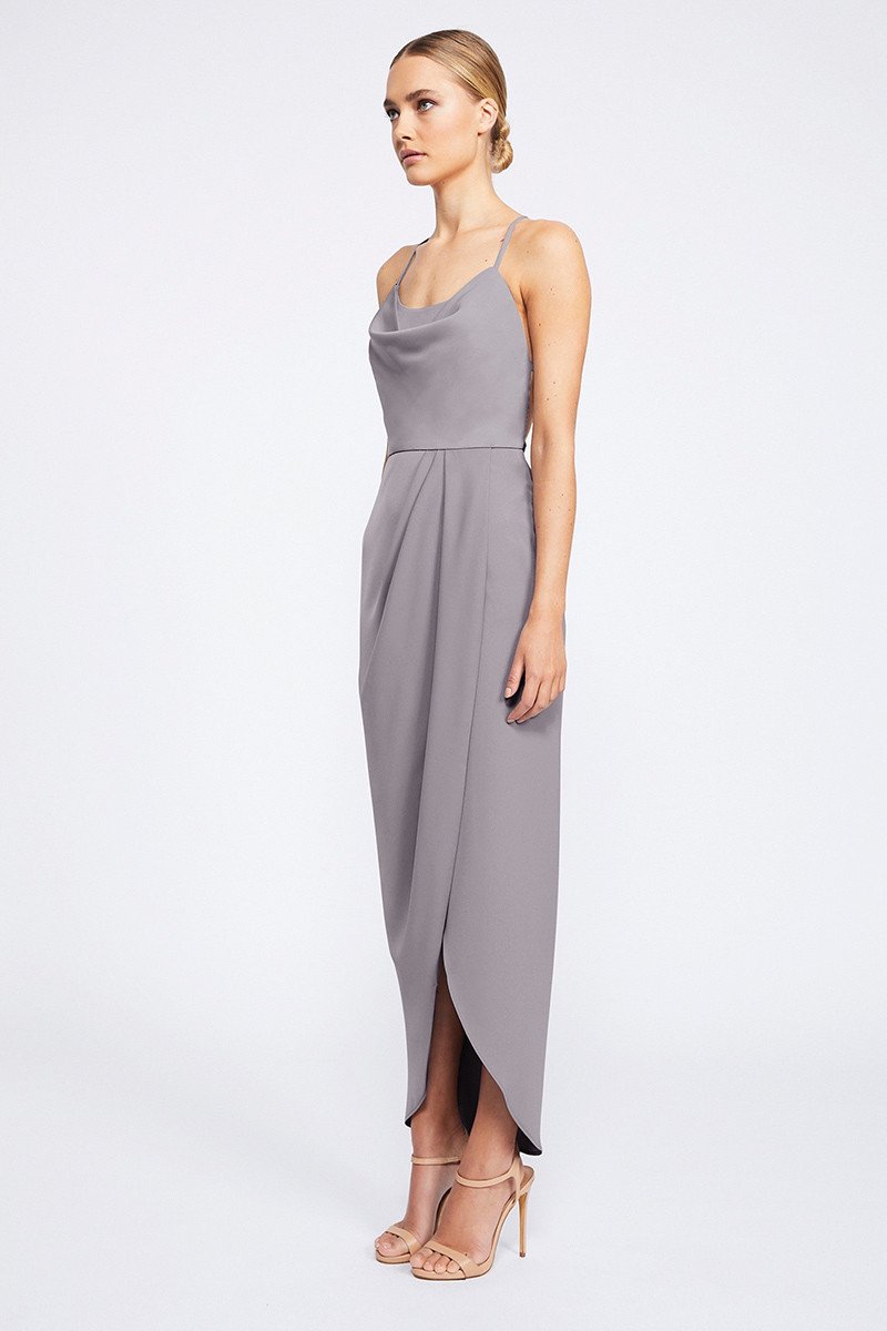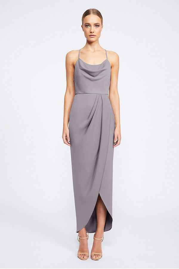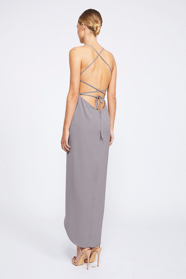 Our signature lace up cowl maxi dress. This dress features a draped cowl neckline, cross over spaghetti straps with a lace up back, tie at waist, a cross over draped skirt with front split, invisible back zip and asymmetric hem