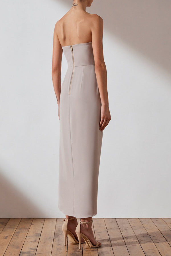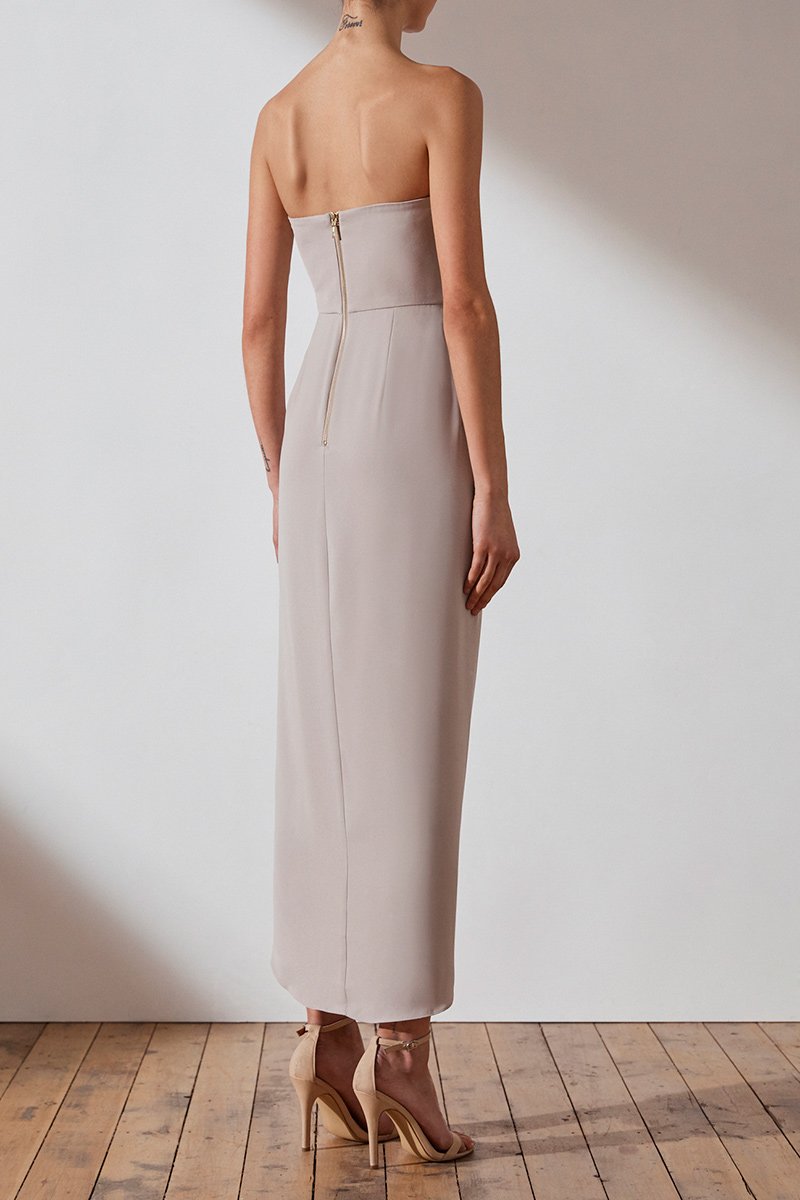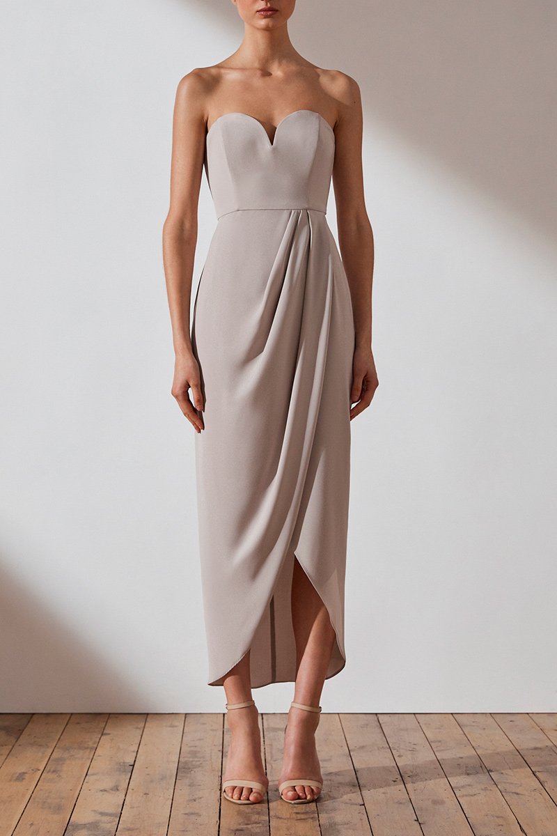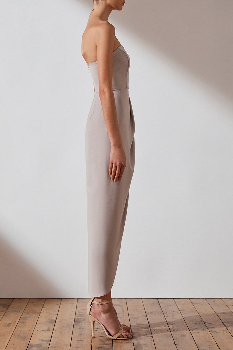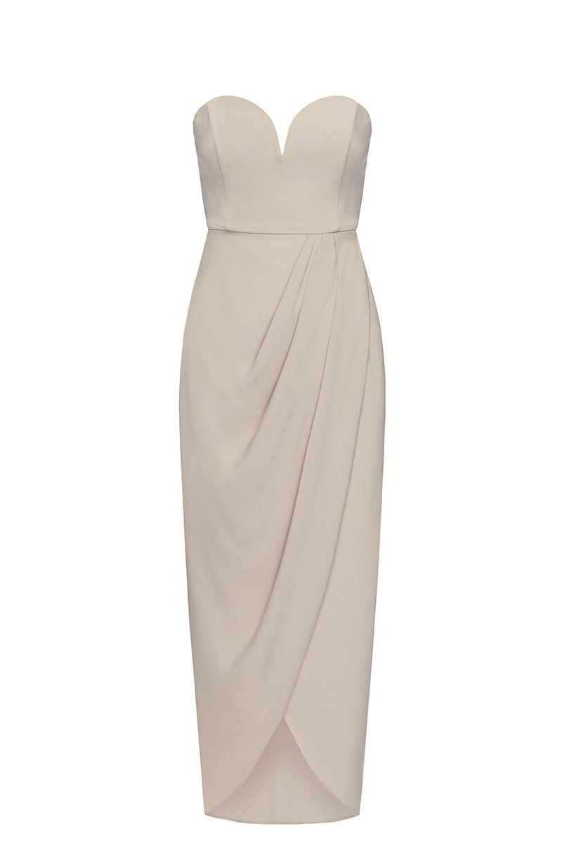 Our signature 'u' bustier maxi dress. This dress featuresa 'u' wire neck, fitted bodice with boning, a cross over draped skirt with front split, luxe gold back zipand asymmetric hem