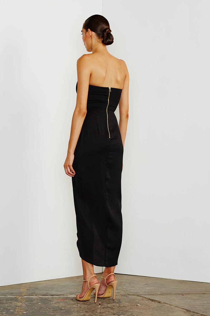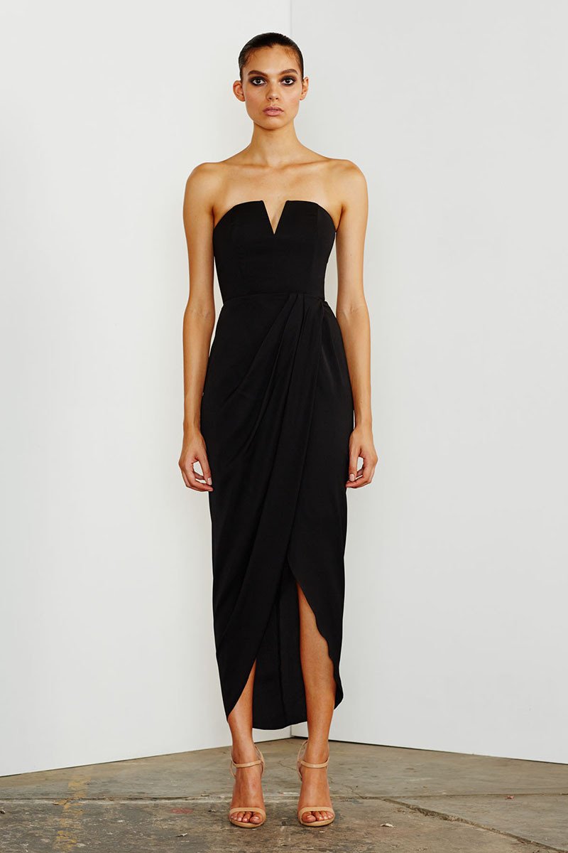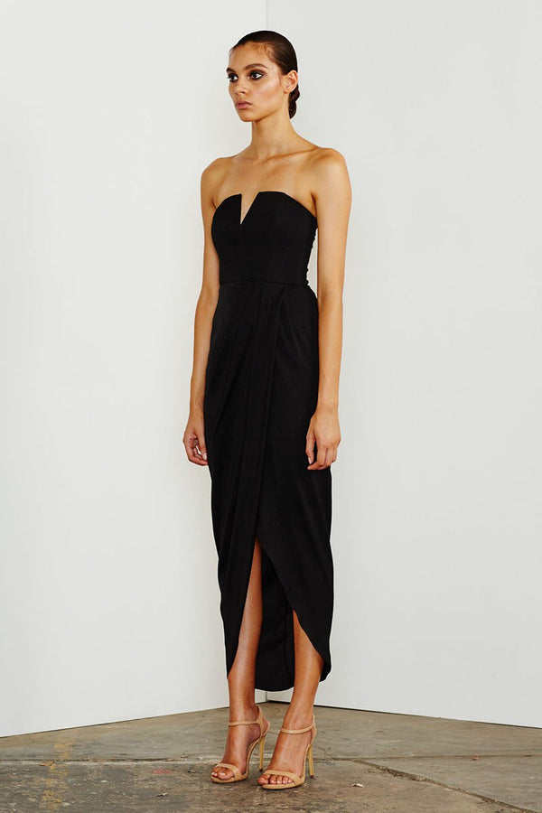 OUR SIGNATURE 'V' BUSTIER MAXI DRESS. THIS DRESS FEATURES A 'V' WIRE NECK, FITTED BODICE WITH BONING AND LINING, A CROSS OVER DRAPED SKIRT WITH FRONT SPLIT, ASYMMETRIC HEM AND LUXE GOLD BACK ZIP.