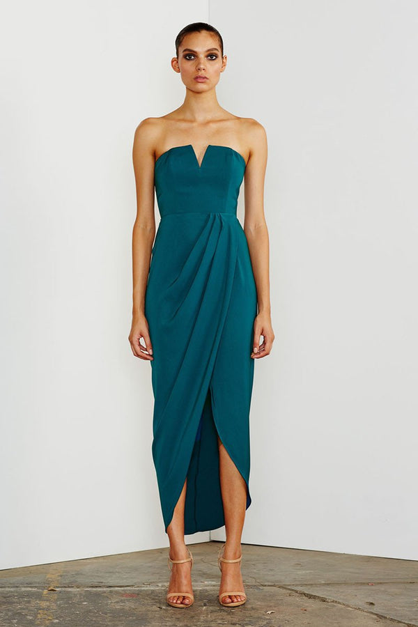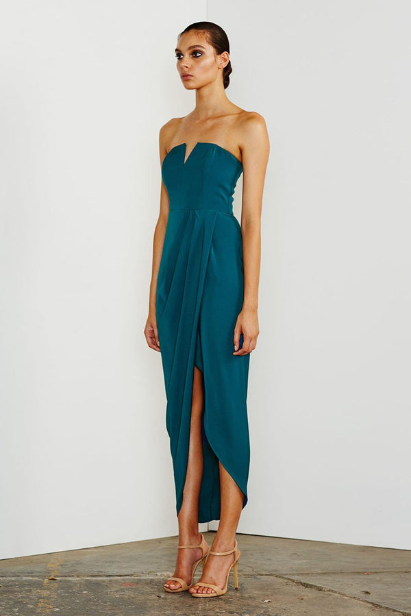 OUR SIGNATURE 'V' BUSTIER MAXI DRESS. THIS DRESS FEATURES A 'U' WIRE NECK, FITTED BODICE WITH BONING AND LINING, A CROSS OVER DRAPED SKIRT WITH FRONT SPLIT, ASYMMETRIC HEM AND LUXE GOLD BACK ZIP.