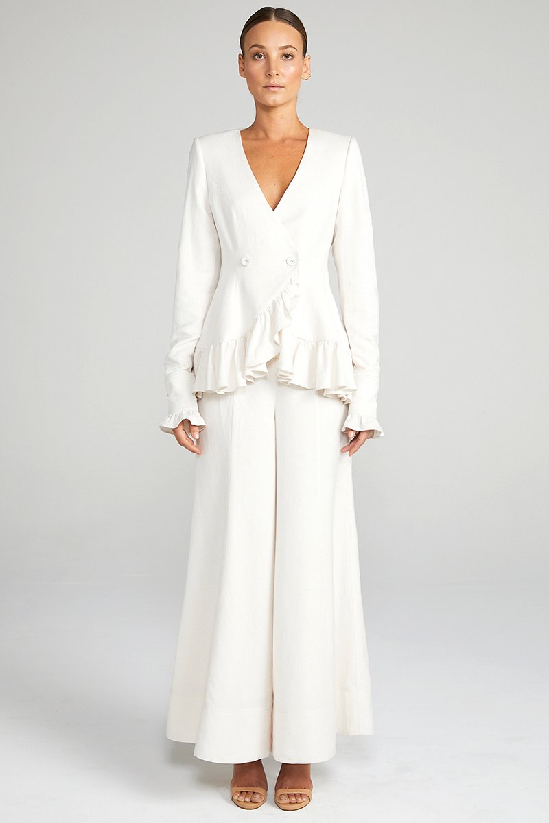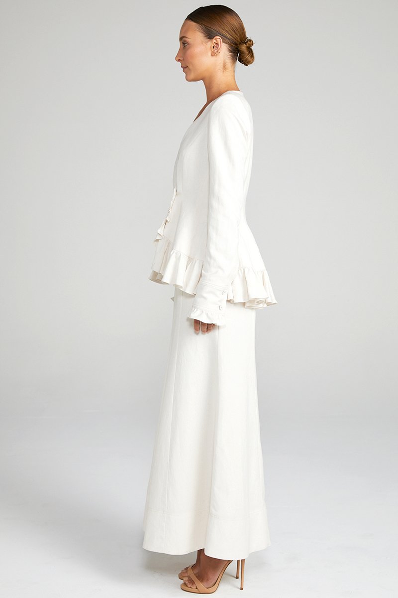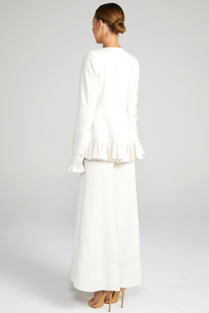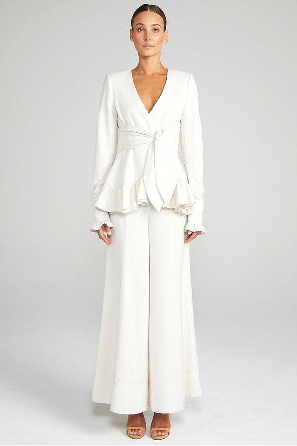 Frill Jacket in a medium weight linen blend. This jacket features double breasted button opening, long sleeves with button cuff opening and frill cuff, detachable waist tie and full lining