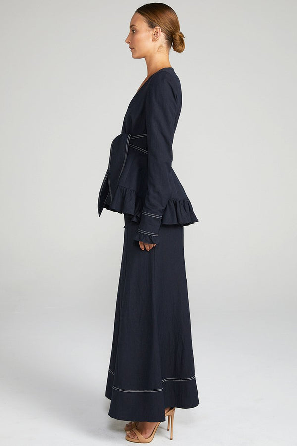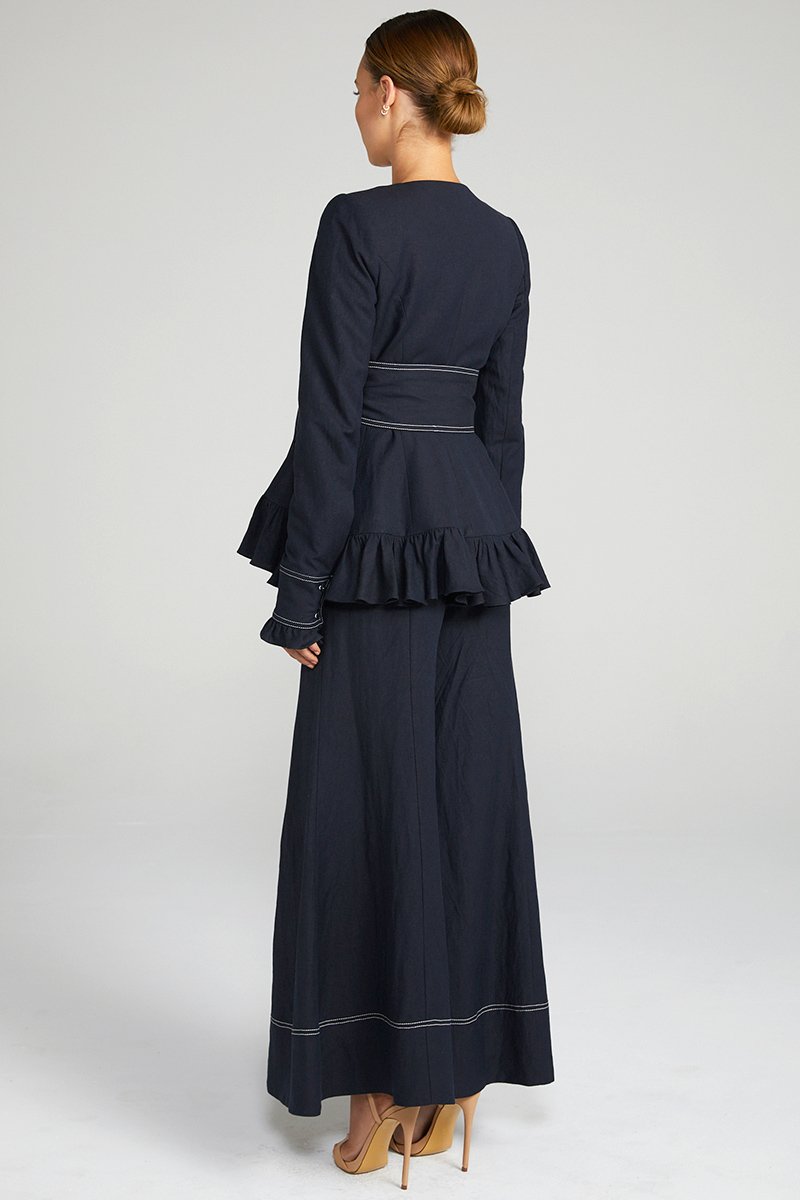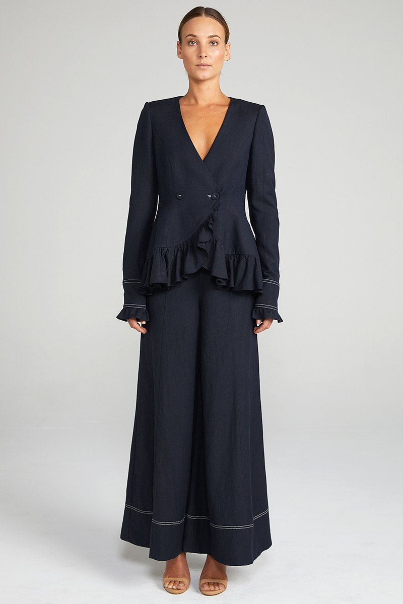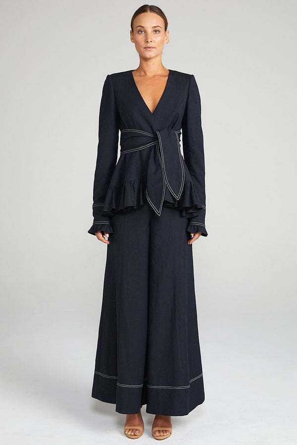 Frill Jacket in a medium weight linen blend. This jacket features double breasted button opening, long sleeves with button cuff opening and frill cuff, detachable waist tie, contrast white topstitching and full lining
