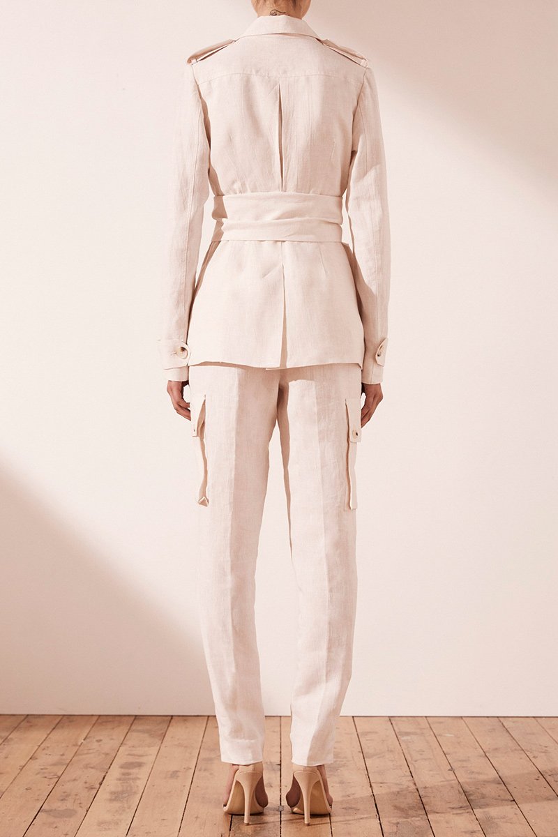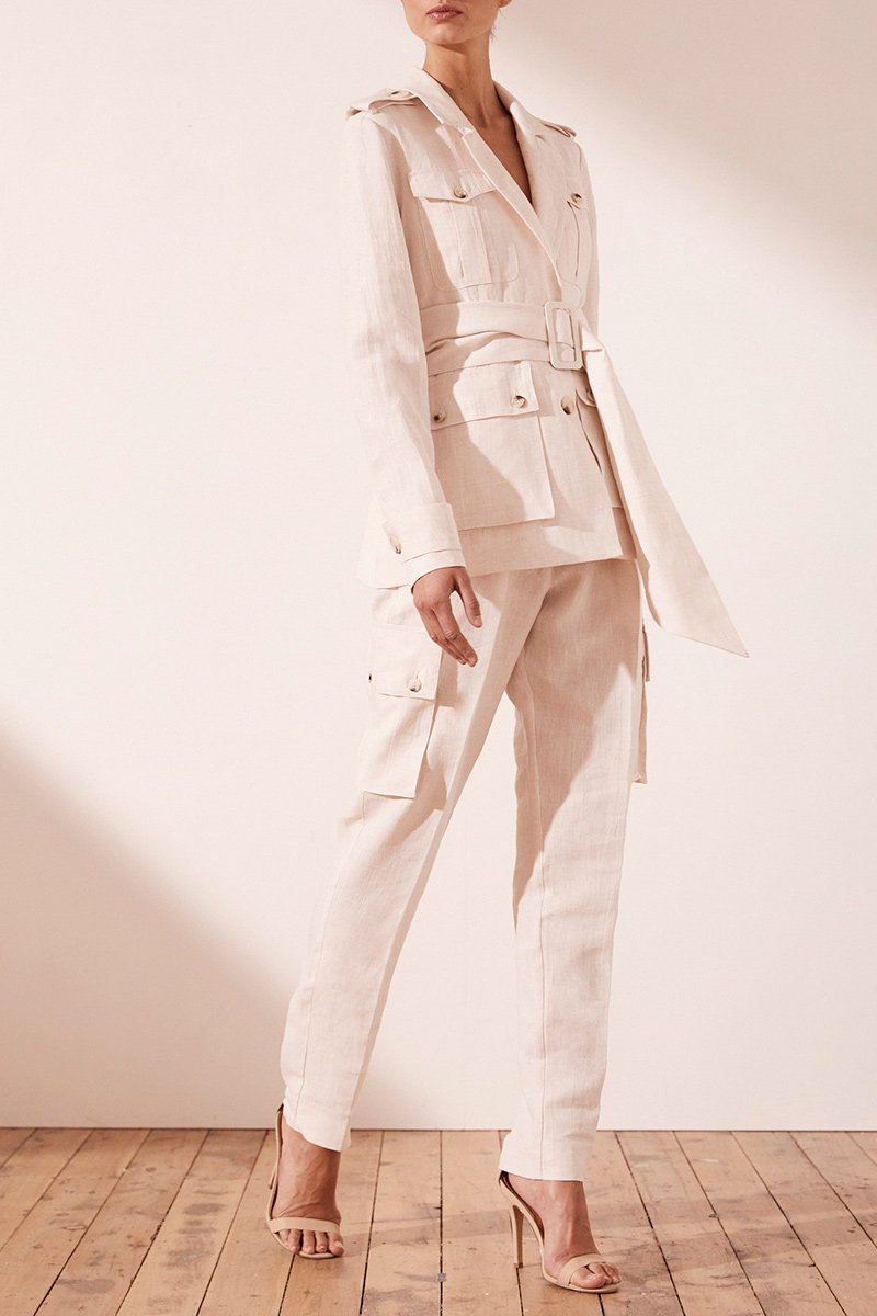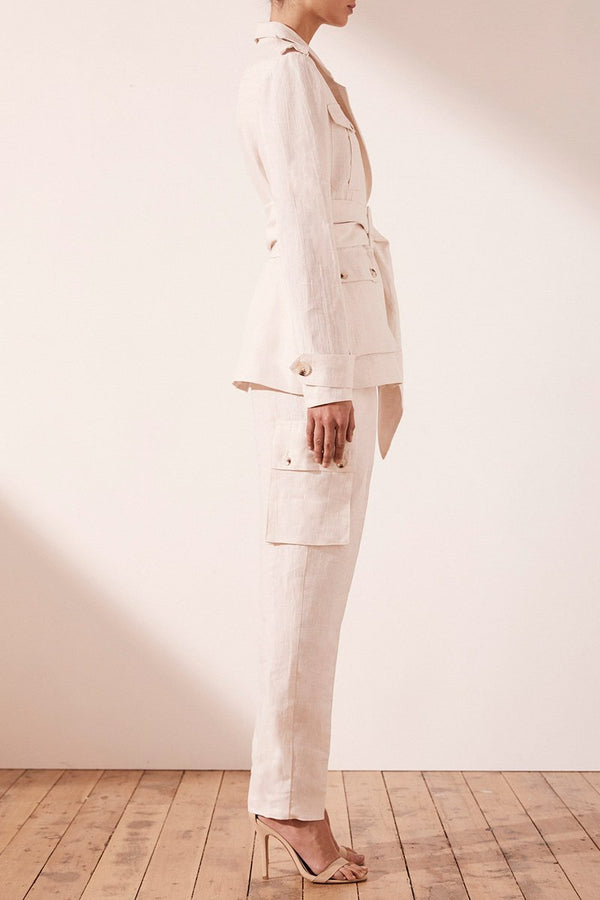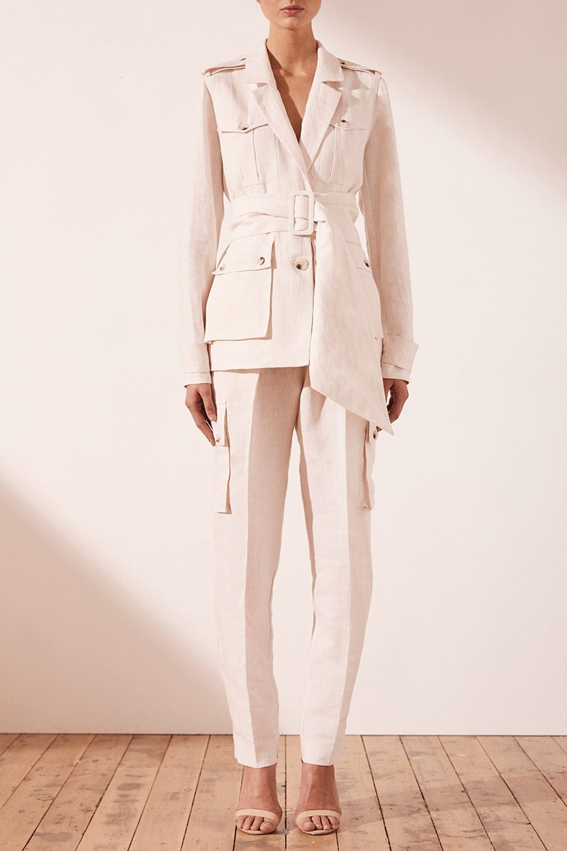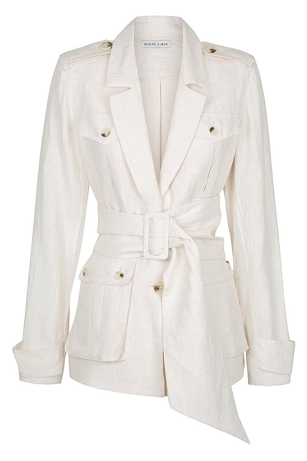Safari jacket in a pure light weight linen in a textured ivory hue. This jacket features pointed lapels, double tortoiseshell button closure, 4 patch pocket design, detachable buckle belt, long slim sleeves with tab closure, back vent and lining