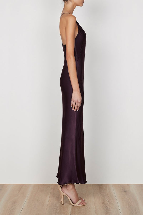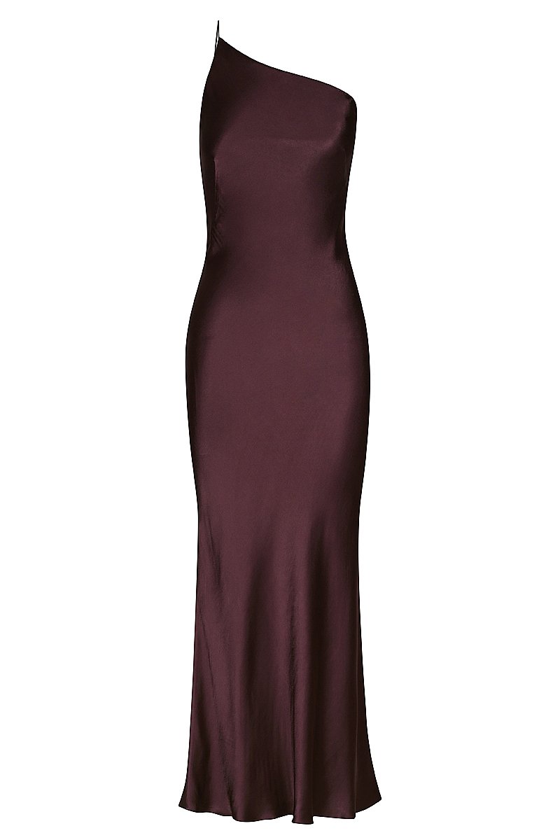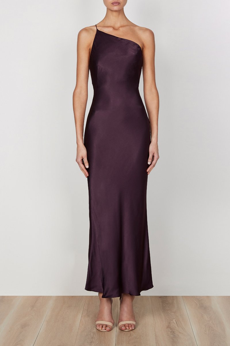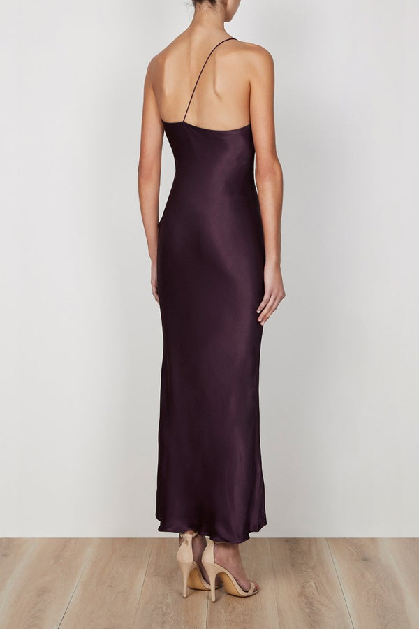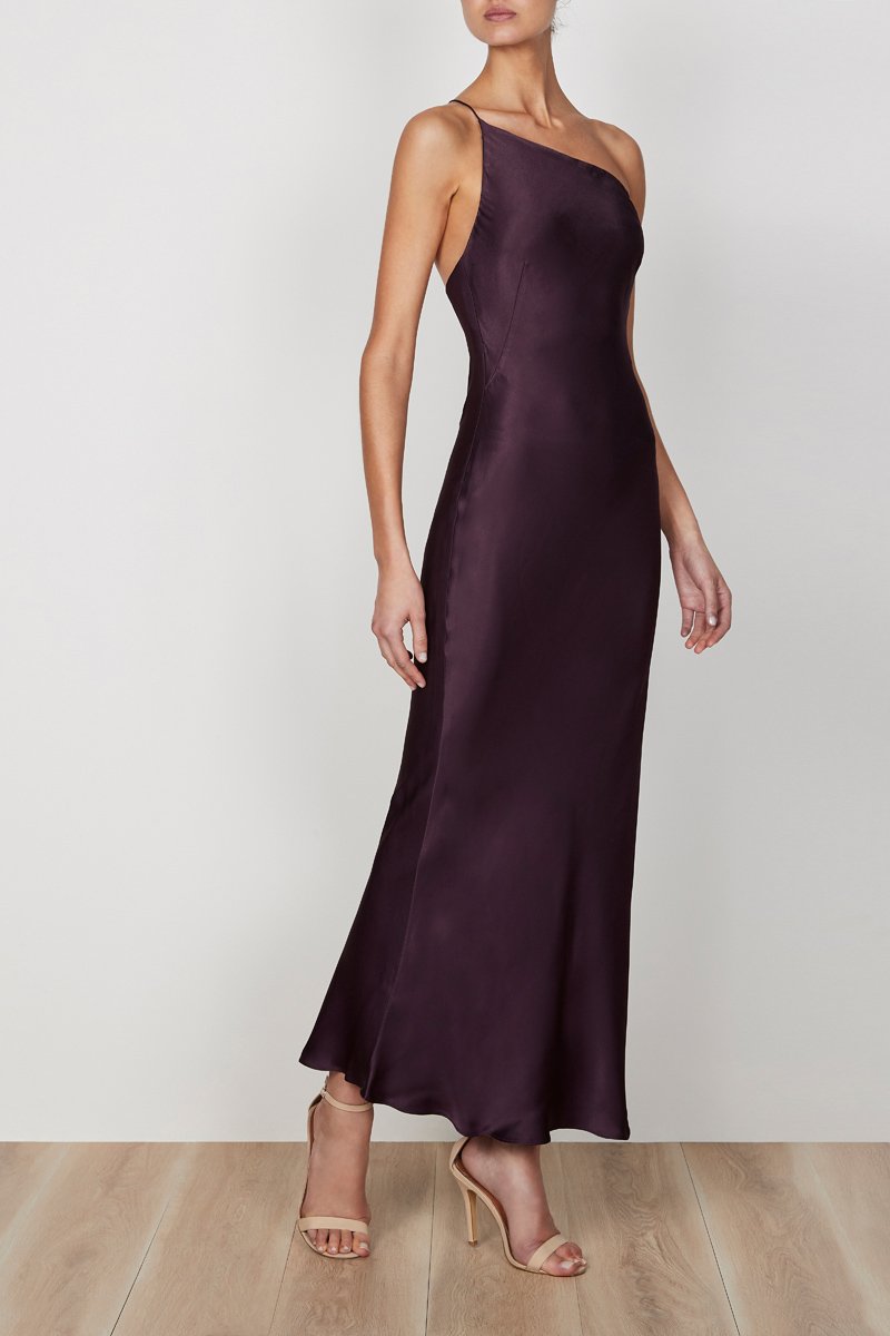 One shoulder bias midi dress in a medium weight woven with a luxurious satin sheen. This dress features a one shoulder neckline with a fixed spaghetti strap, invisible side zip and slight flare at hem