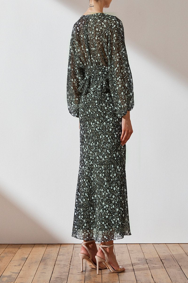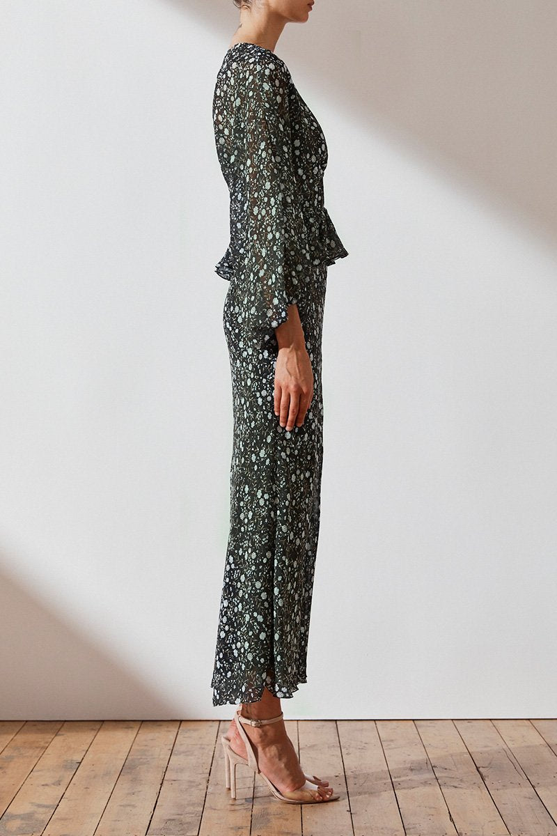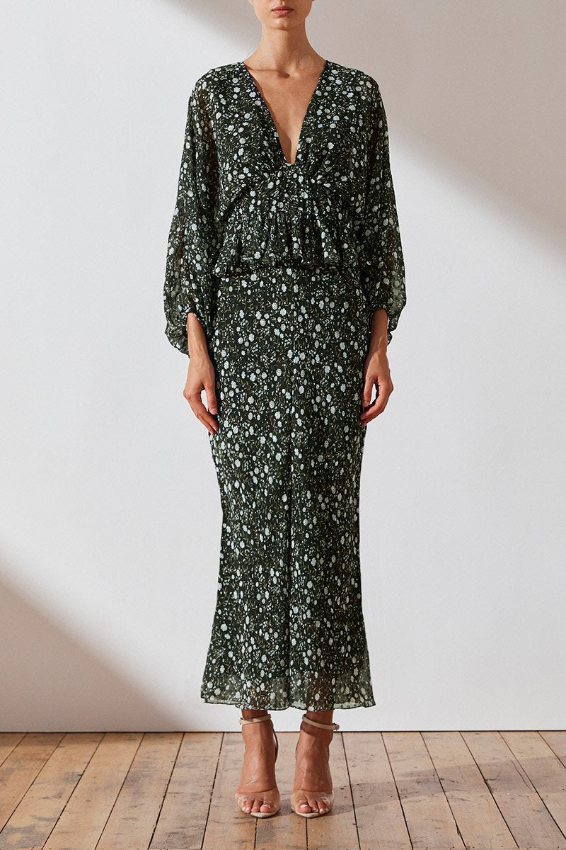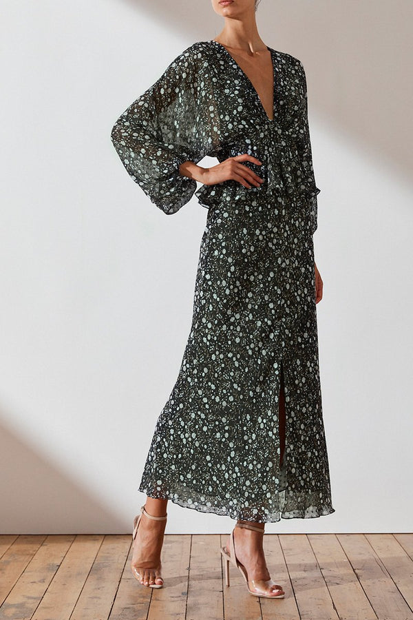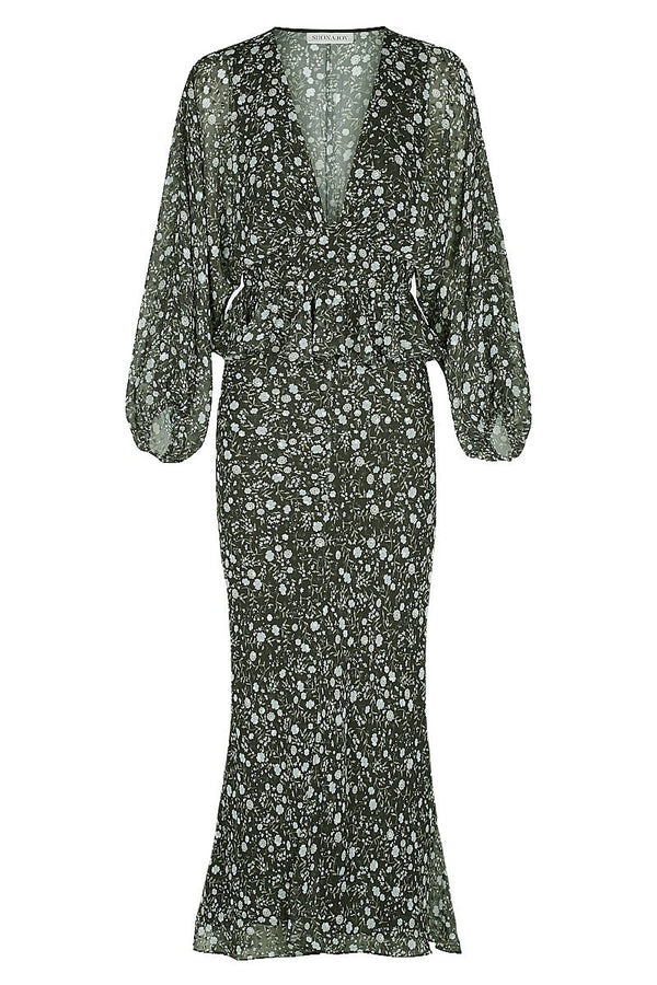 Plunged bias midi dress in the exclusive Jarrett floral print. This dress in a light weight dobby spot chiffon with a semi-sheer appearance features plunged neckline, raglan midi sleeve with elasticated cuff, fitted waist with peplum frill, invisible side zip, flared hem and lining