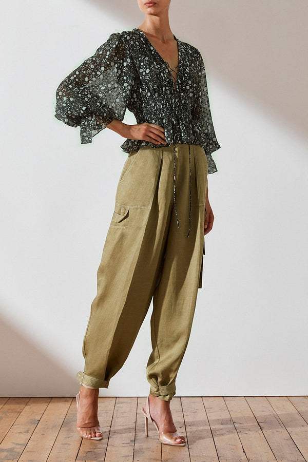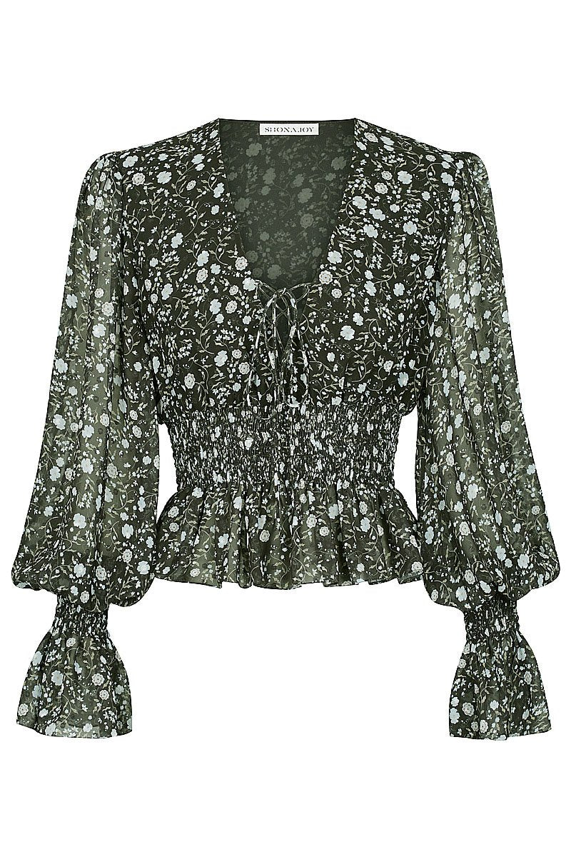 Shirred blouse in the exclusive Jarrett floral print. This dress in a light weight dobby spot chiffon with a semi-sheer appearance features low v neckline with lace up front, voluminous sleeve with shirred cuff, shirred waist, peplum frill and lining