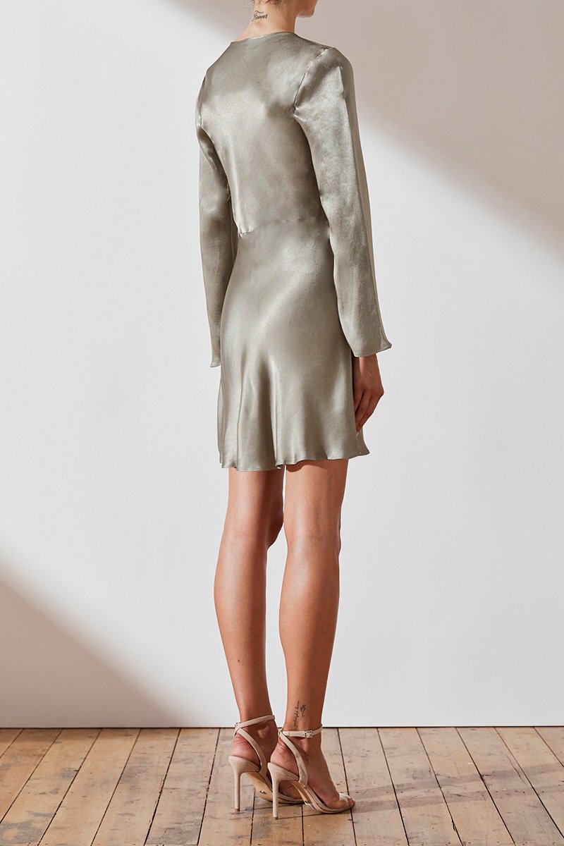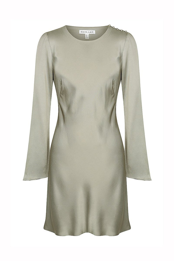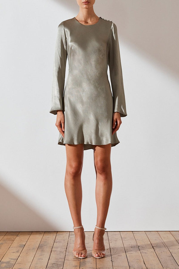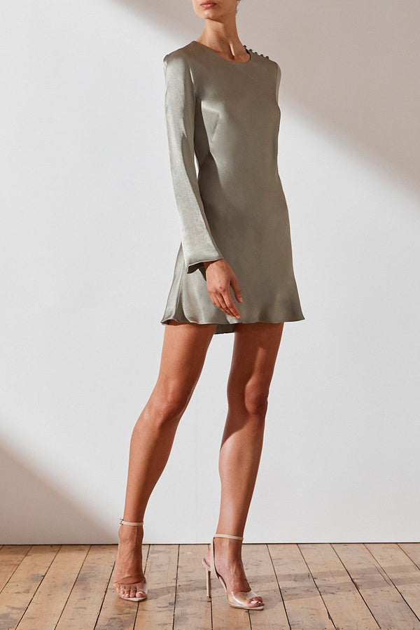 Long sleeve bias mini dress in a medium weight woven with a luxurious satin sheen. This dress features round neckline, button tab at shoulder, invisible side zip and slight flare at hem