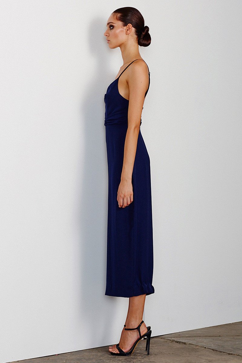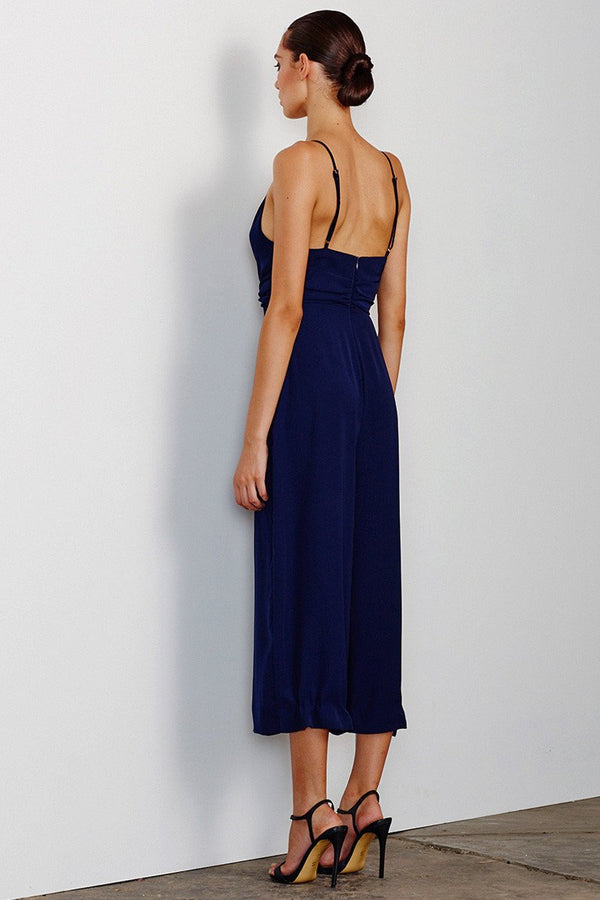 CROPPED WIDE LEG JUMPSUIT IN A NAVY MEDIUM WEIGHT WOVEN FABRIC. THIS JUMPSUIT FEATURES A PLUNGED 'V' WIRE NECKLINE, ADJUSTABLE SPAGHETTI STRAPS, CROSS OVER FABRIC DETAIL AT WAIST AND INVISIBLE BACK ZIP