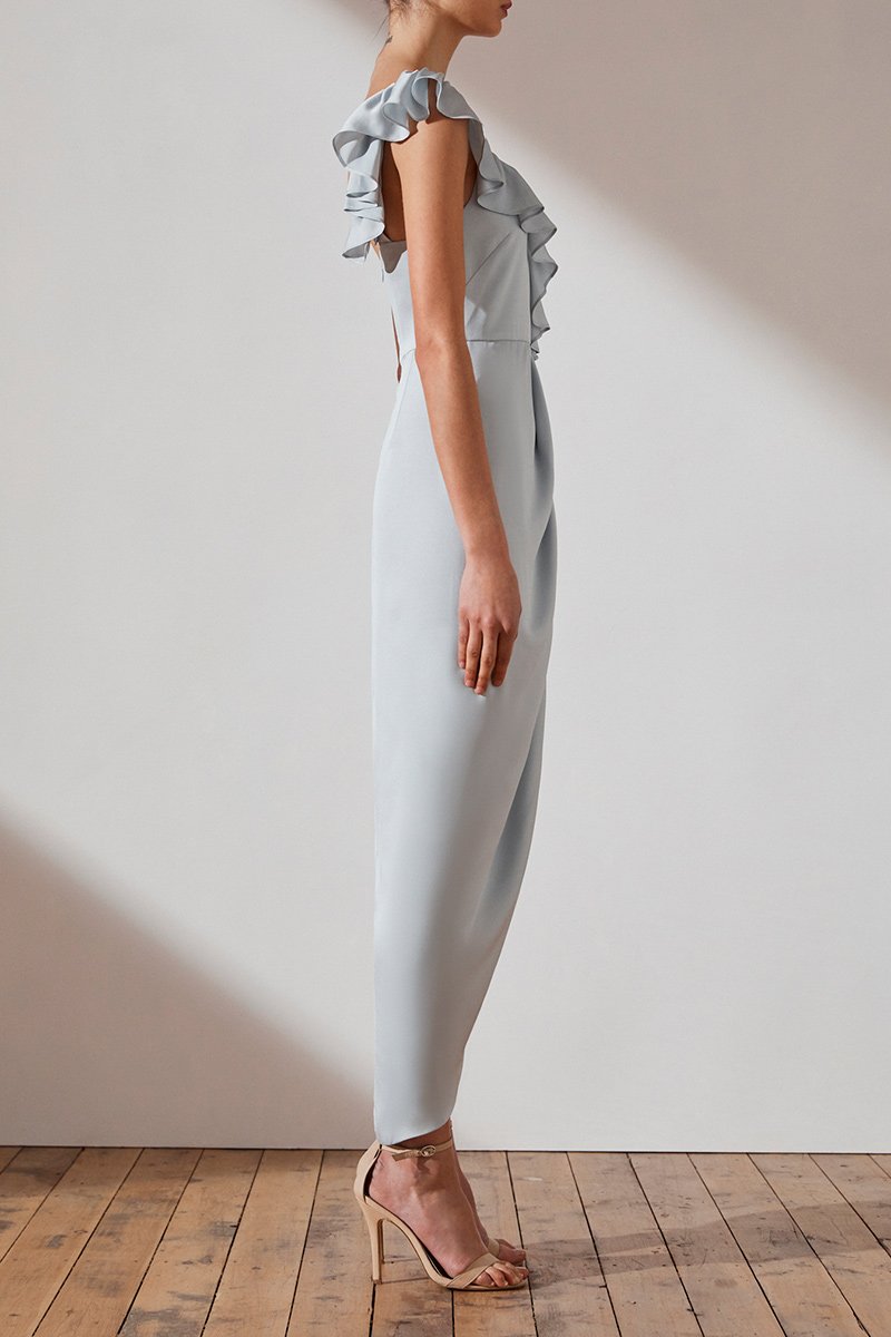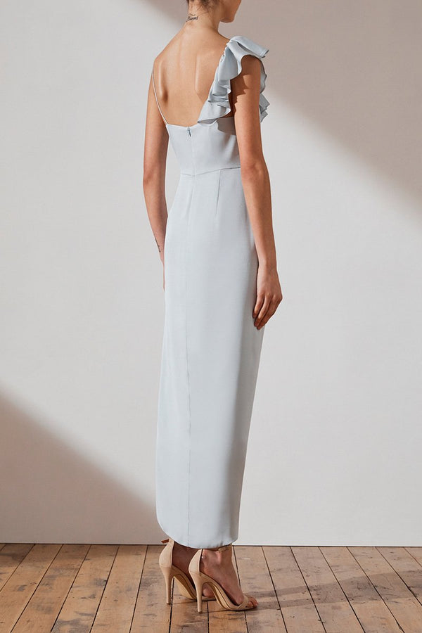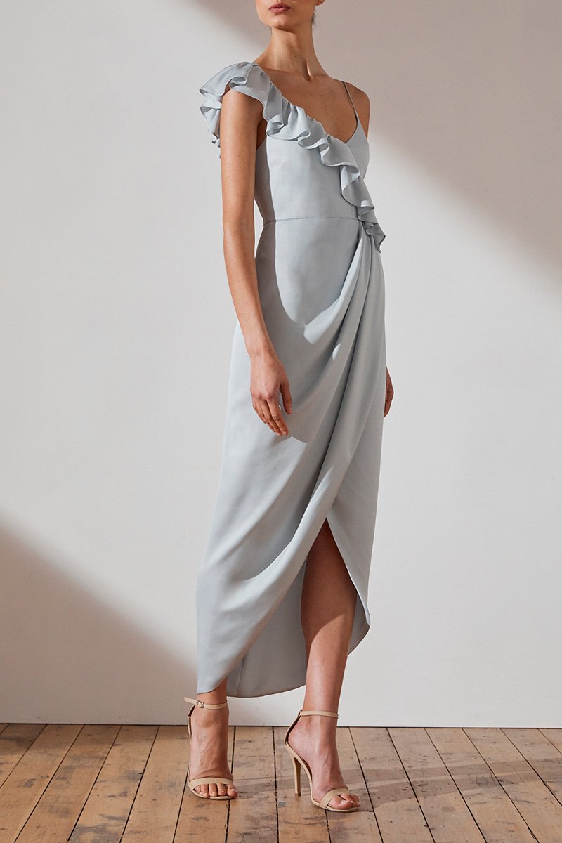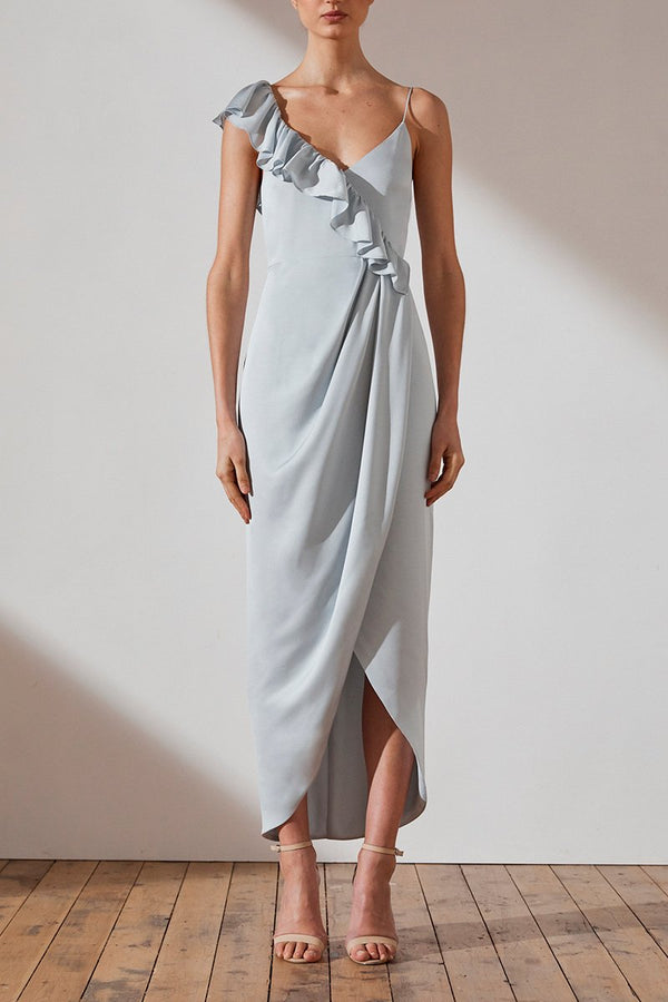 Luxe asymmetrical frill dress in a light weight woven fabric with a silk touch. This dress features spaghetti straps with asymmetrical frill, invisible back zip, cross over draped skirt with front split and lining