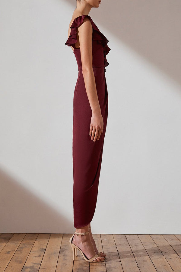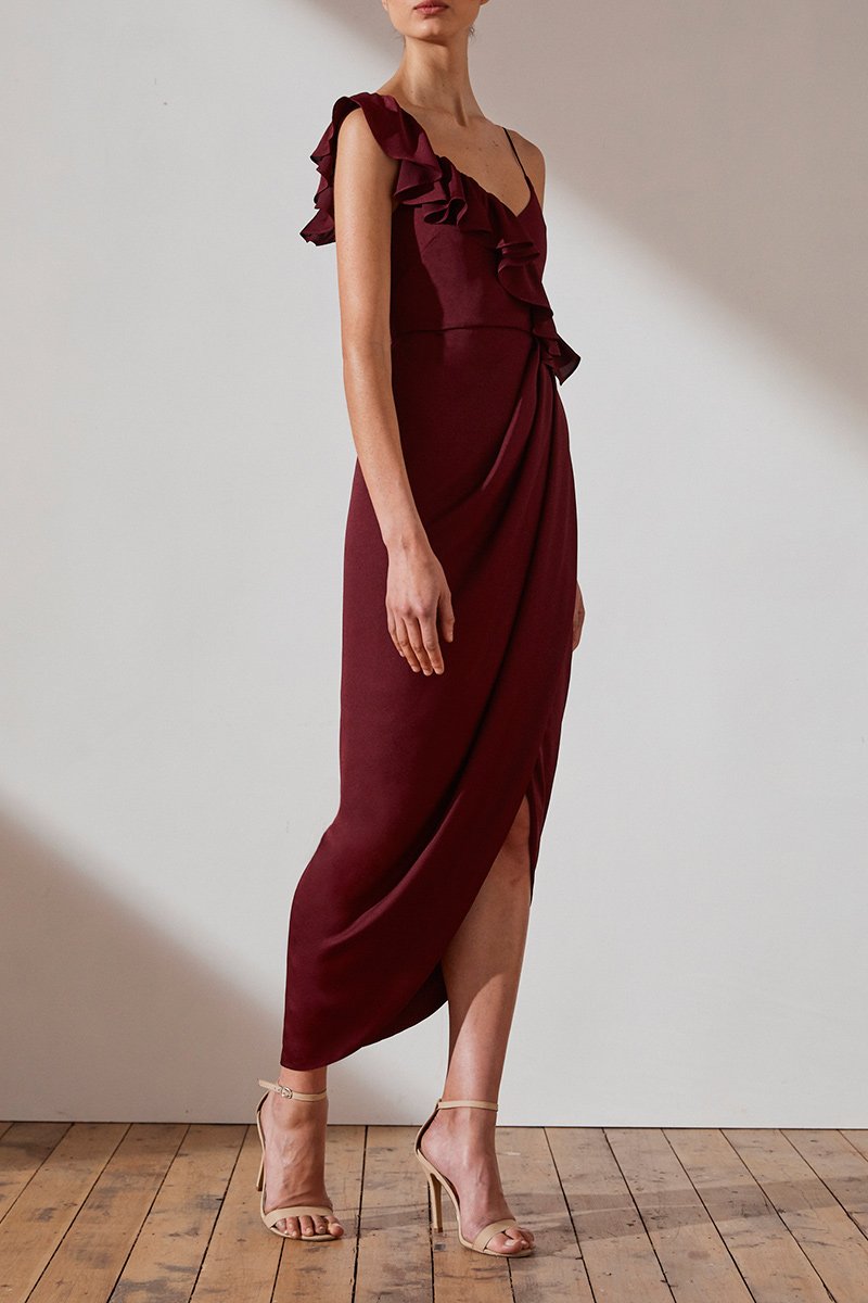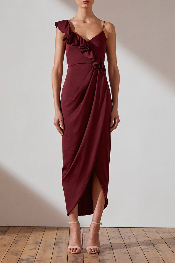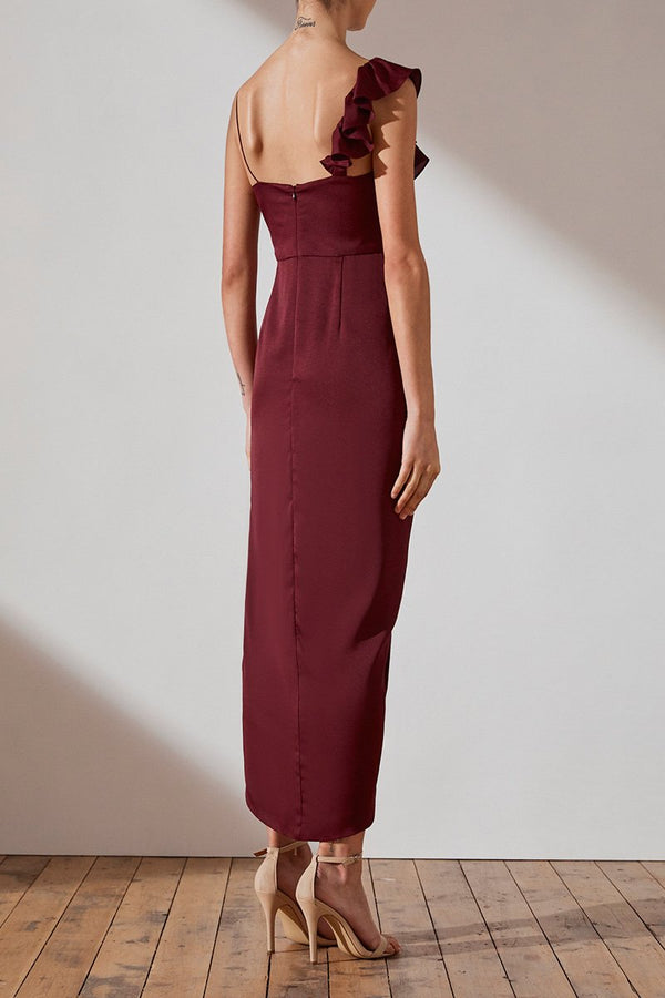 Luxe asymmetrical frill dress in a light weight woven fabric with a silk touch. This dress features spaghetti straps with asymmetrical frill, invisible back zip, cross over draped skirt with front split and lining