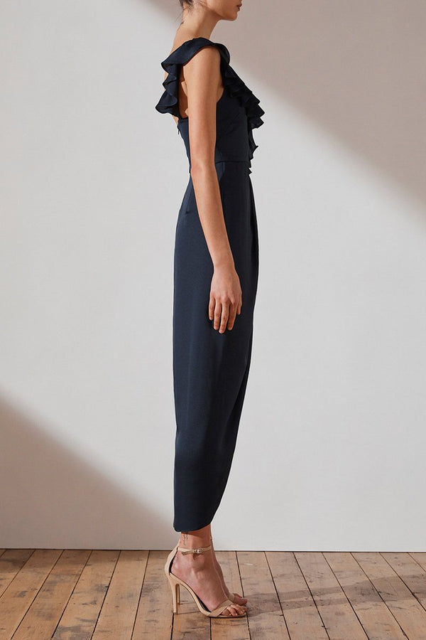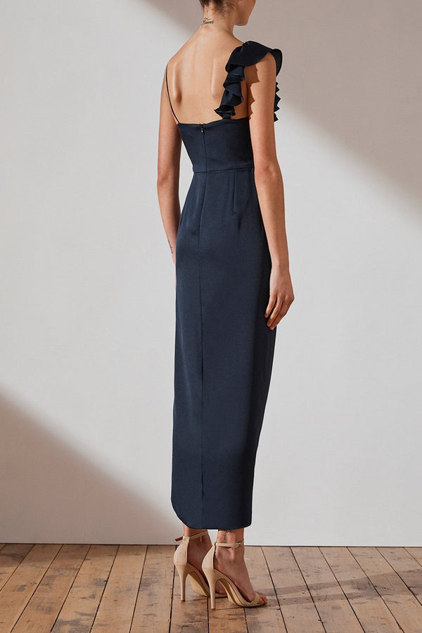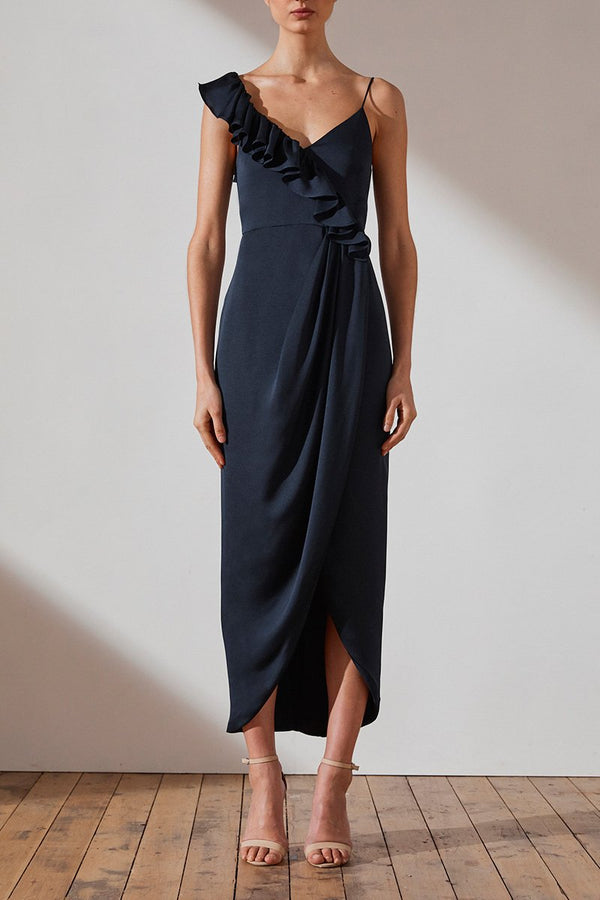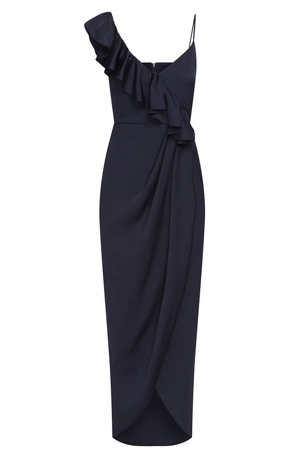 Luxe asymmetrical frill dress in a light weight woven fabric with a silk touch. This dress features spaghetti straps with asymmetrical frill, invisible back zip, cross over draped skirt with front split and lining