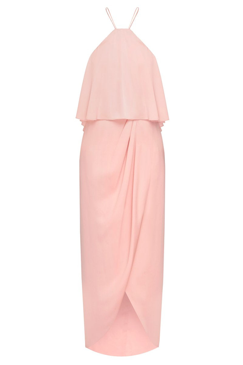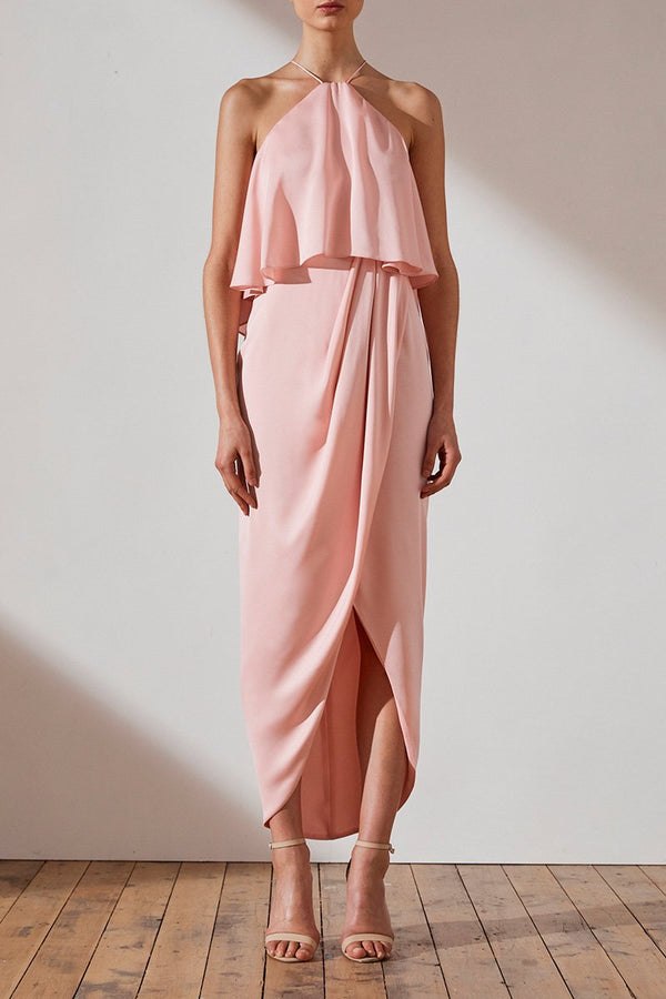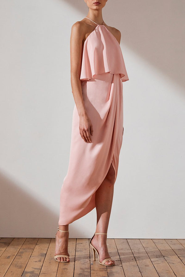 Luxe halter frill dress in a light weight woven fabric with a silk touch. This dress features halter neck, tie at back neck, layered frill bodice, invisible back zip, cross over draped skirt with front split and lining