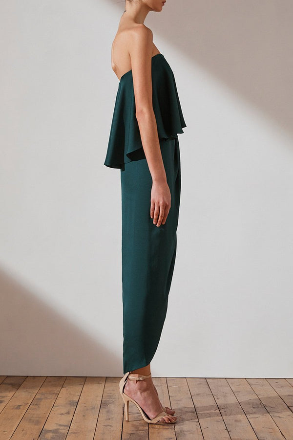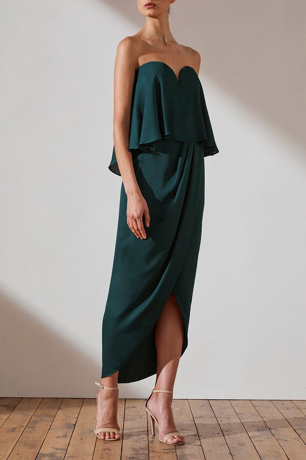 Luxe 'u' wire frill dress in a light weight woven fabric with a silk touch. This dress features 'u' wire neckline, fitted bodice with boning and frill overlay, invisible back zip, cross over draped skirt with front split and lining