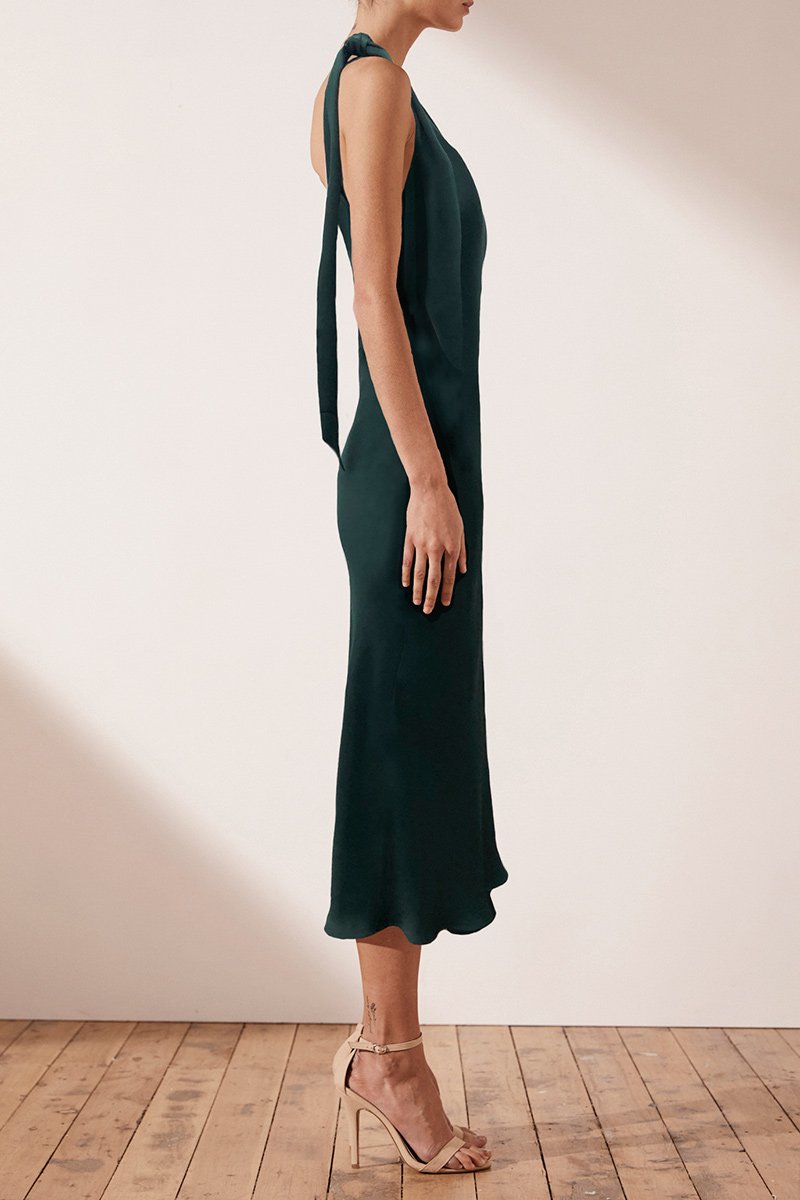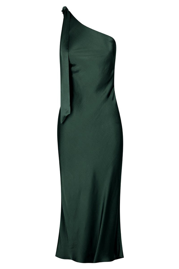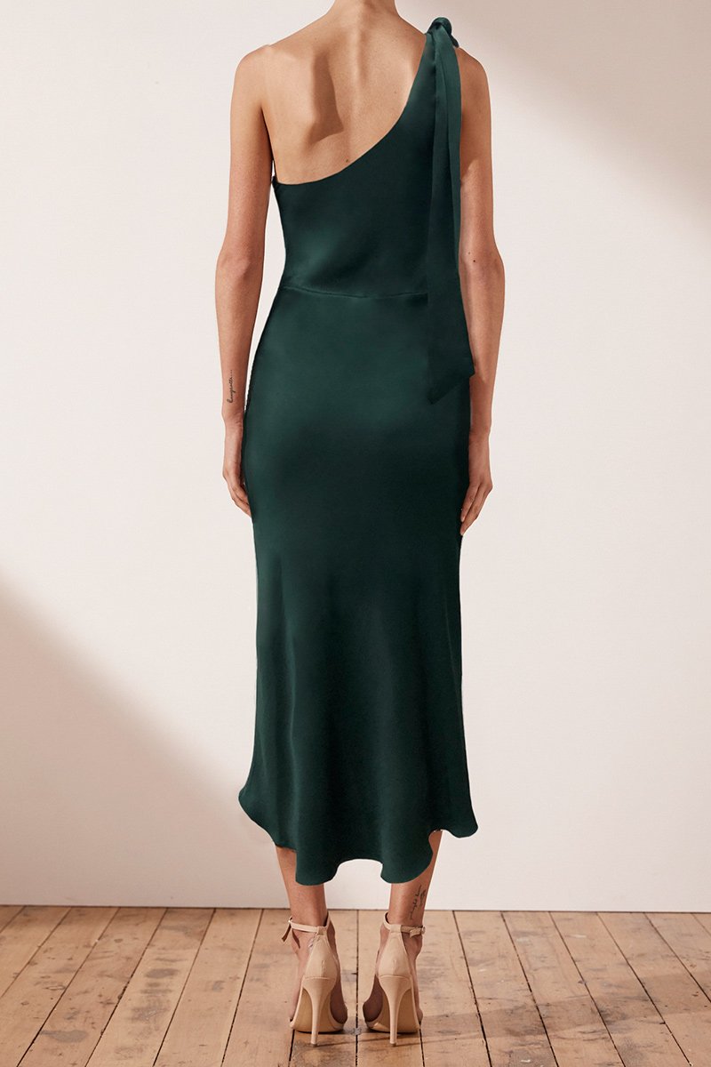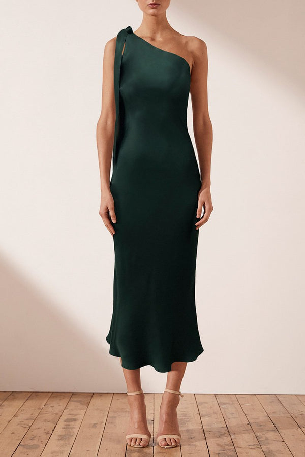 One shoulder bias midi dress in a medium weight woven with a silk touch. This dress features one shoulder with fabric tie, invisible side zip and slight flare at hem