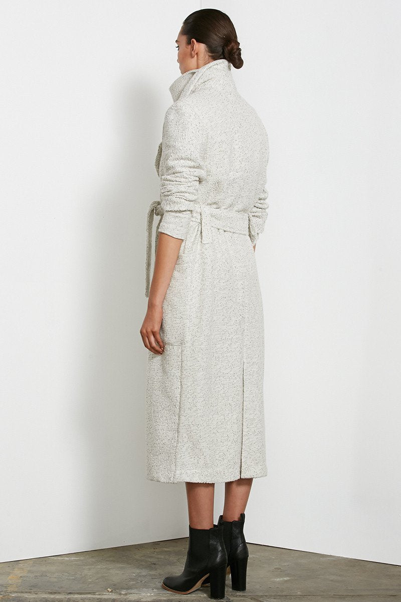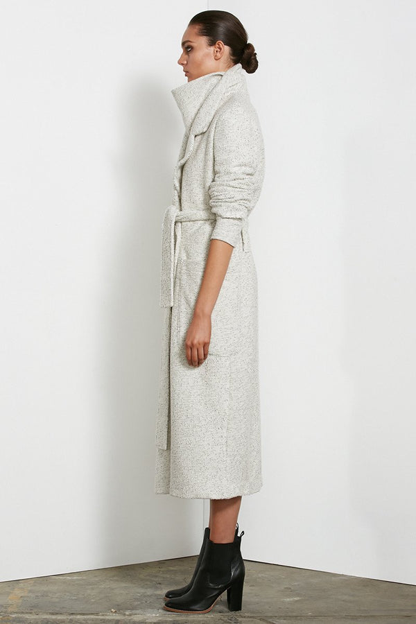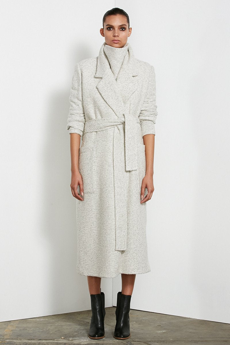MIDI LENGTH COAT IN OUR EXCLUSIVE BOUCLE KNIT. THIS COAT FEATURES OVERSIZE SIDE POCKETS, LONG SLEEVES, A DOUBLE BREASTED DOUBLE BUTTON FASTENING AND TIE AT WAIST.