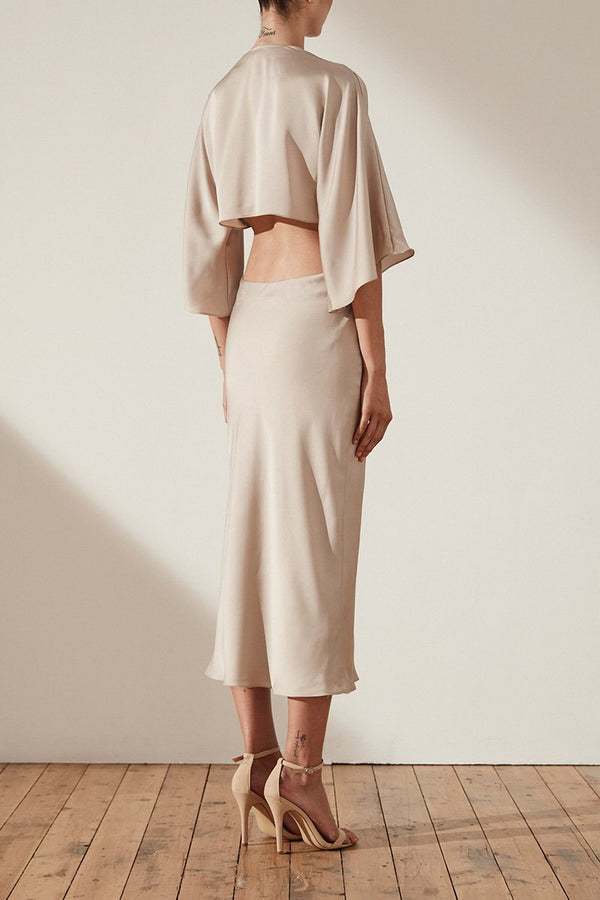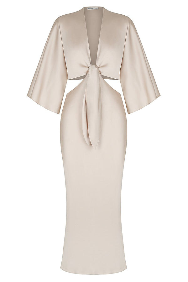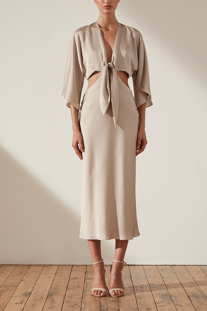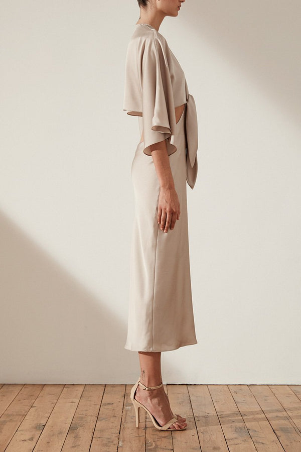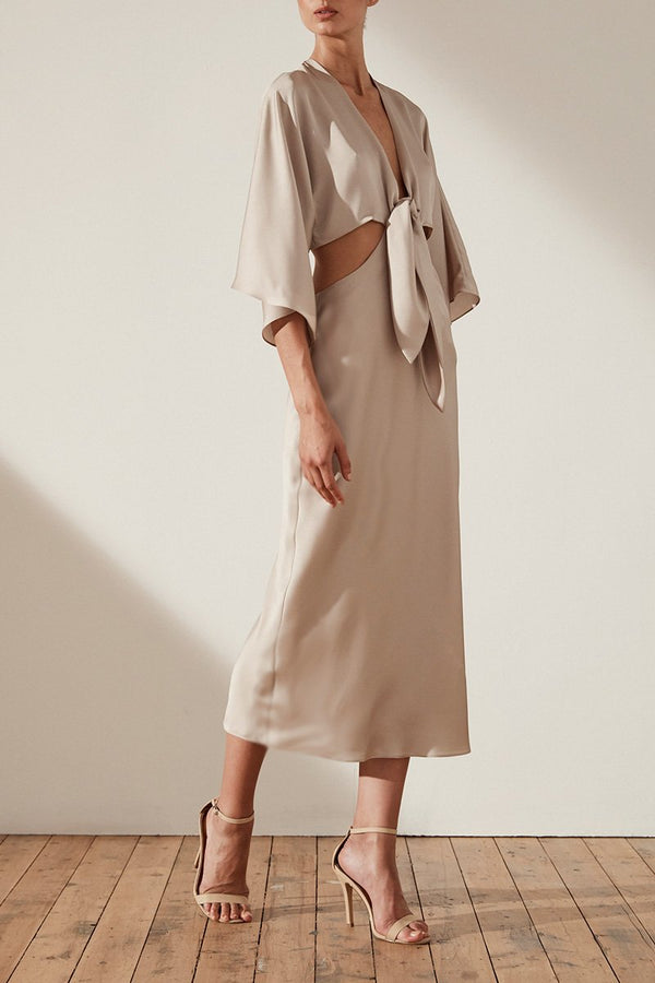 Tie front cut out midi dress in a light weight woven with a silk touch. This dress features low neckline with tie front closure, midi length sleeves, cut out side and back, midi length skirt with slight flare at hem and lining