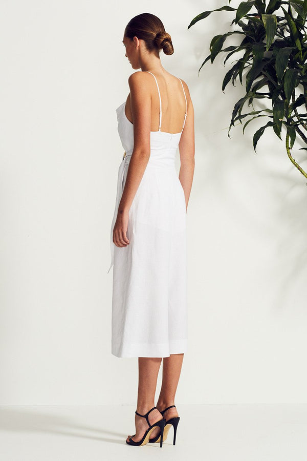 COWL JUMPSUIT IN A MEDIUM WEIGHT LINEN. THIS JUMPSUIT FEATURES A COWL NECKLINE, ADJUSTABLE SPAGHETTI STRAPS, LINED TOP, BELT WITH GOLD HOOP FASTENING, POCKETS, INVISIBLE BACK ZIP AND CROPPED PANT