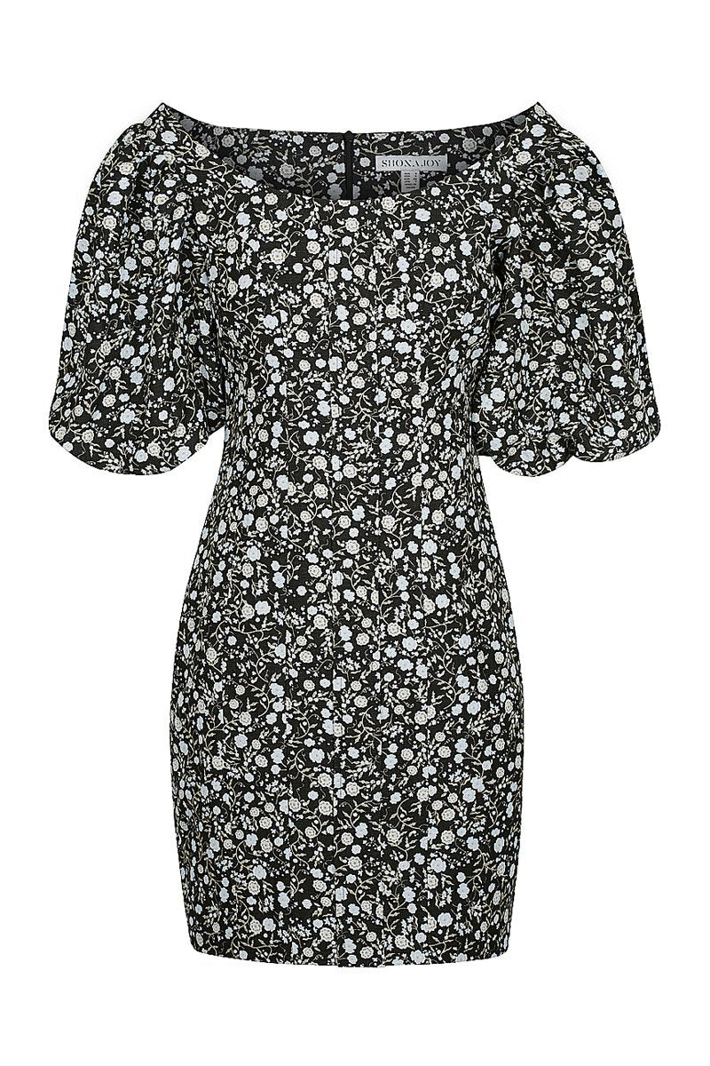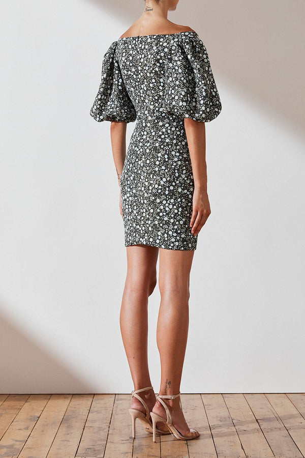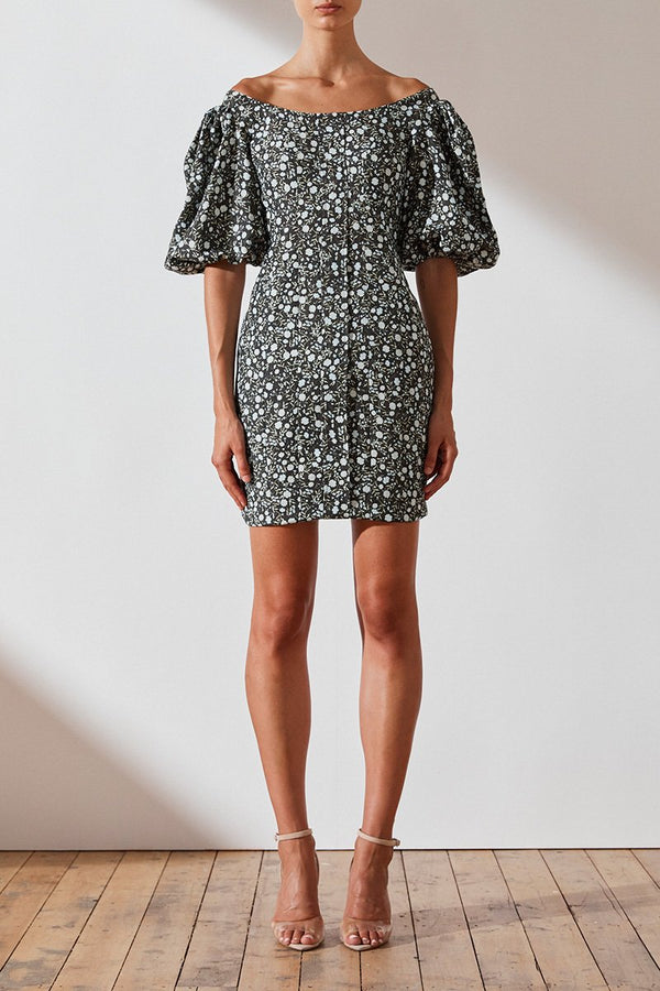 Fitted mini dress in a light weight linen in the exclusive Parker floral print. This dress features off the shoulder neckline, decorative front tab, puff sleeve with elasticated cuff, invisible back zip and lining