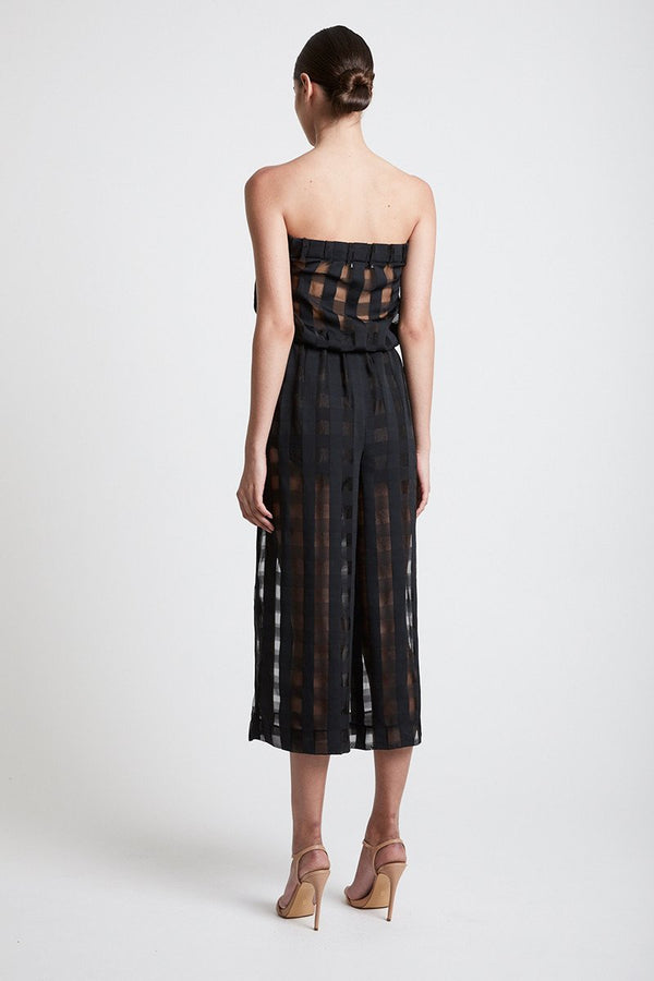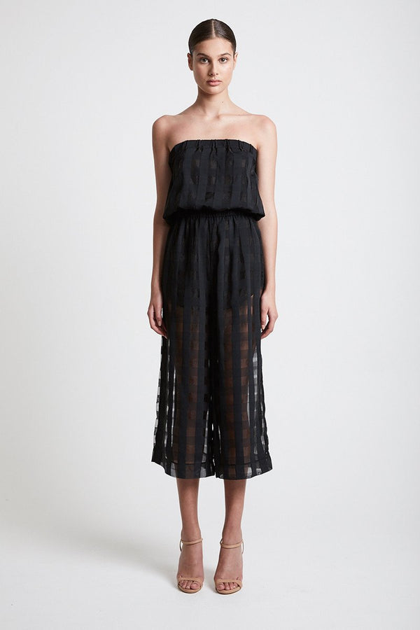 Elasticated jumpsuit in a light weight sheer plaid fabric. This jumpsuit features elasticated shoulders and waist and midi length pants with short leg lining