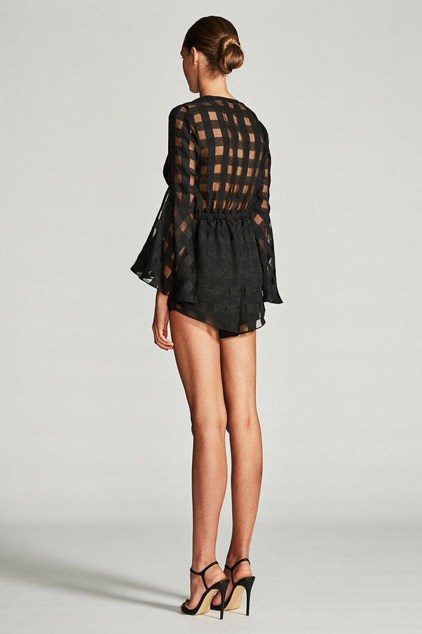 Tie front playsuit in a light weight sheer plaid fabric. This playsuit features tie front closure, midi length flared sleeves, elasticated back waist and short leg length with lining