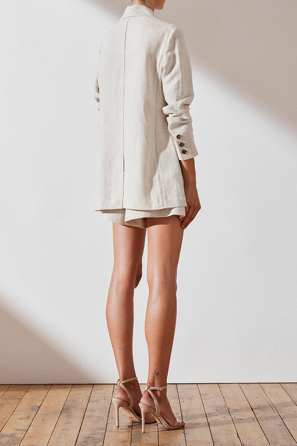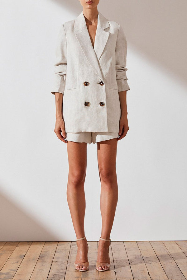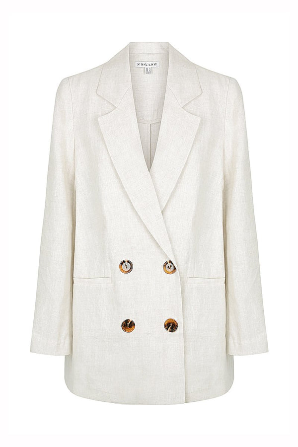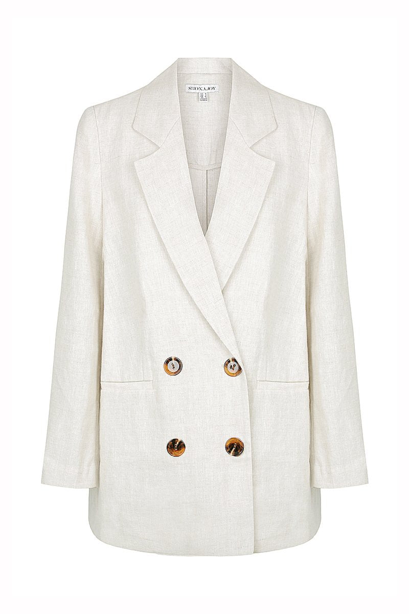 Double breasted blazer in a pure light weight linen in a natural stone hue. This jacket features pointed lapels, double breasted tortoiseshell button fastening, welt pockets, long slim sleeves and back vent