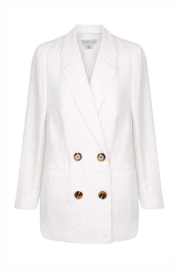 Double breasted blazer in a pure light weight linen with a semi-sheer appearance. This jacket features pointed lapels, double breasted tortoiseshell button fastening, welt pockets, long slim sleeves and back vent