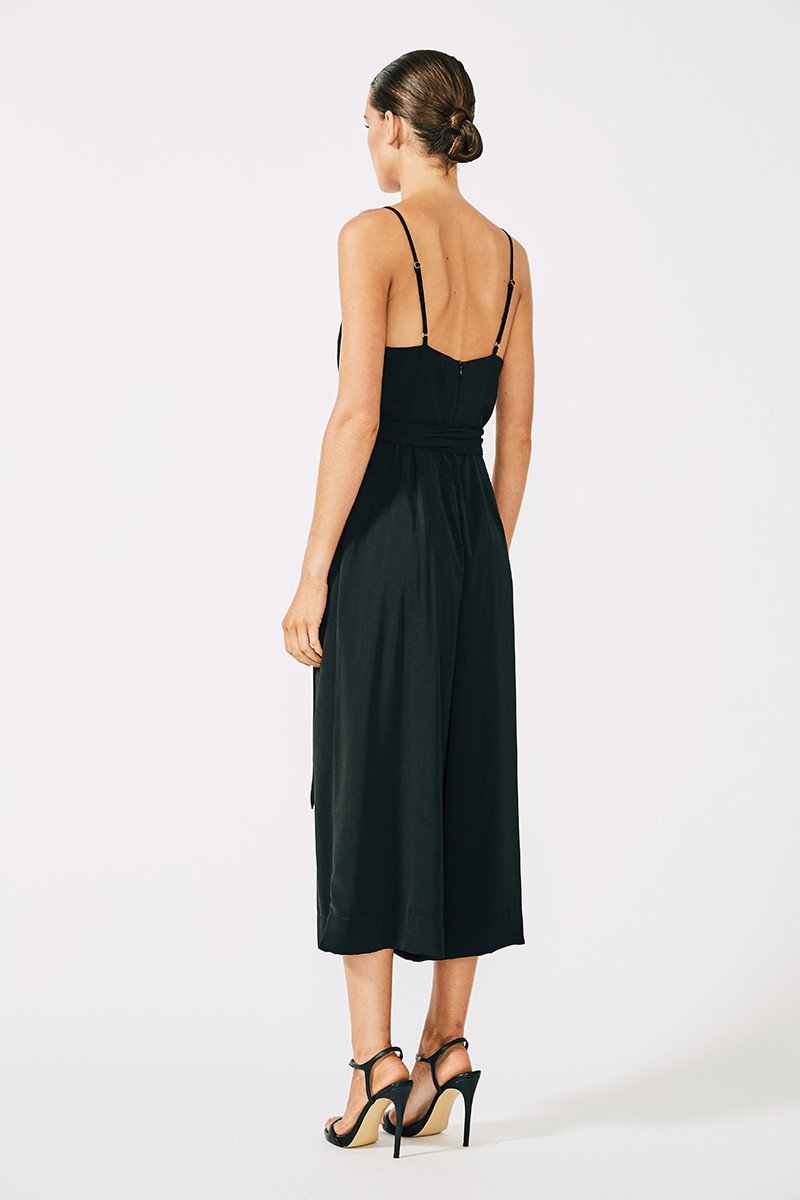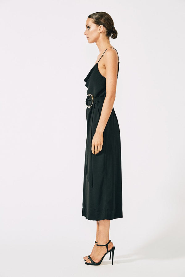 COWL JUMPSUIT IN A MEDIUM WEIGHT SILK TOUCH WOVEN FABRIC. THIS JUMPSUIT FEATURES A COWL NECKLINE, SPAGHETTI STRAPS, LINED TOP, BELT WITH GOLD HOOP FASTENING, POCKETS, INVISBALE BACK ZIP AND CROPPED PANT